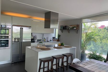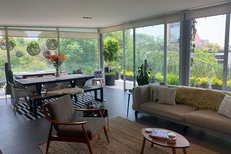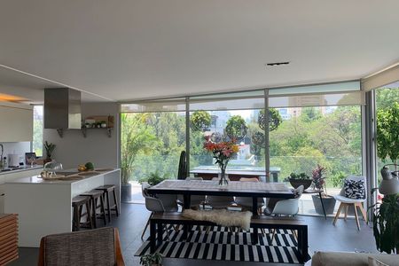 Renta de departamento con excelente ubicación amueblado moderno minimalista cuenta con amplia estancia, con balcón al frente , 2 Recamaras y además un amplio Family, dos y medio baños, cuarto de servicio, amplia cocina, espacio para lavandería, garage 2 autos. Vigilancia 24/7. Luminoso, techos altos, pisos duela, calefacción Hidronica,