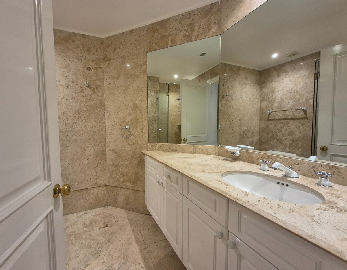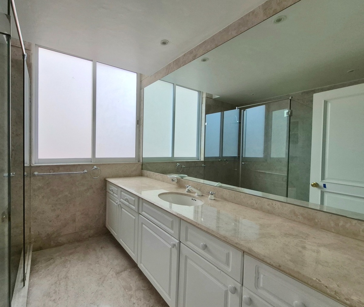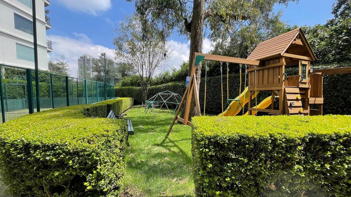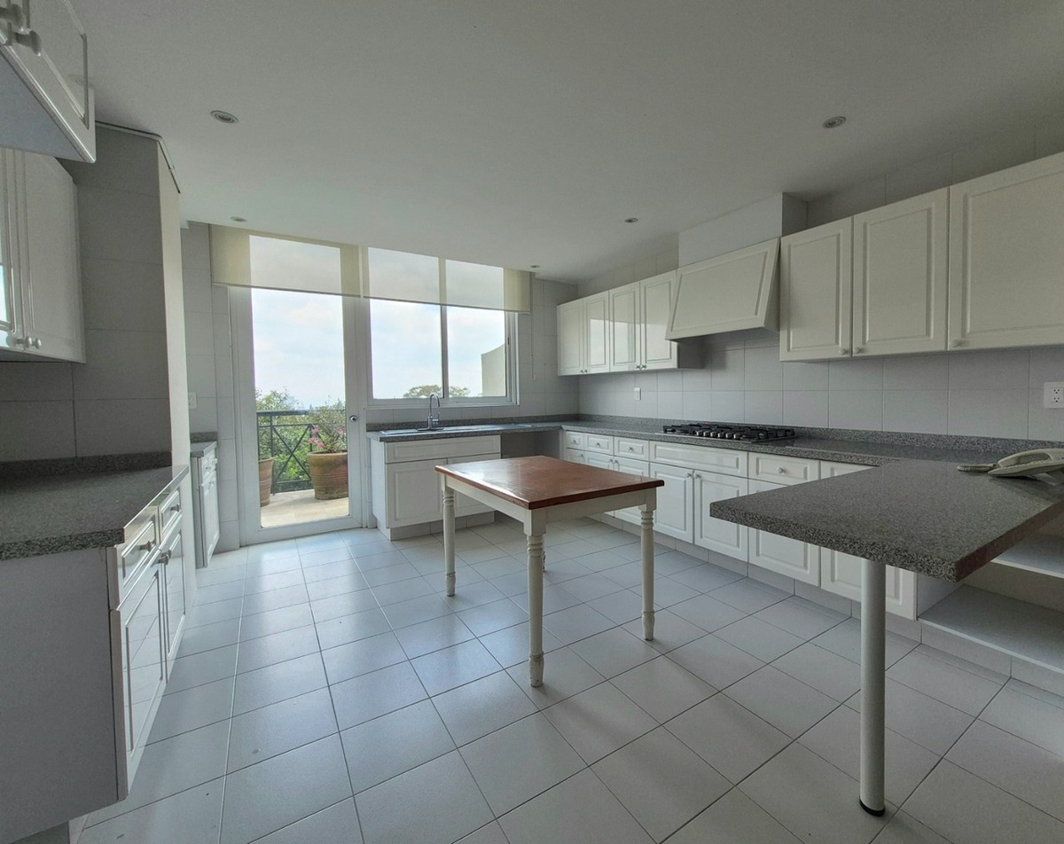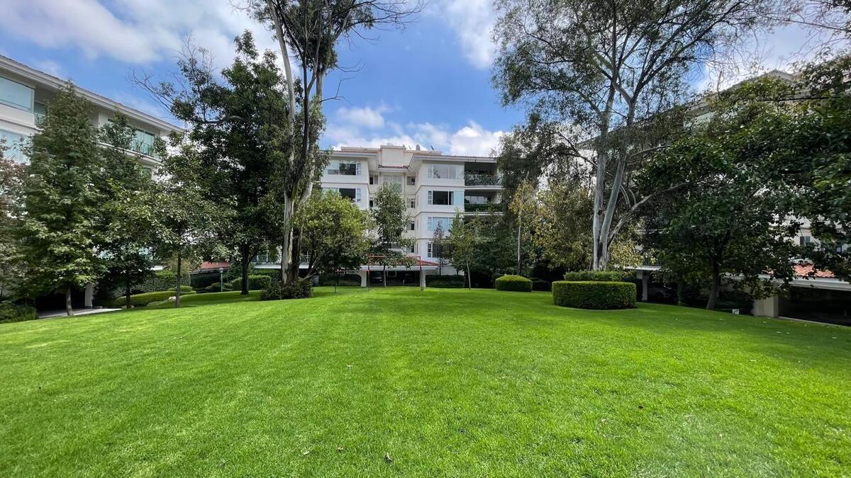 Cuenta con cuatro recámaras, cada una con baño y vestidor. Dispone de dos terrazas, una de 60 m² y otra de 15 m², con vista arbolada en todo el departamento. Incluye cuatro lugares de estacionamiento techados e independientes.