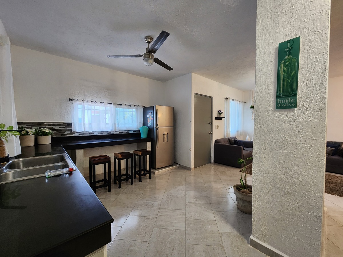Amplia cocina de concepto abierto remodelada con parilla de gas empotrada en meseta, campana , gavetas abiertas asi como alacena, equipada con algunos en enseres de cocina, barra desayunadora o de trabajo con vista a la calle y bancos.