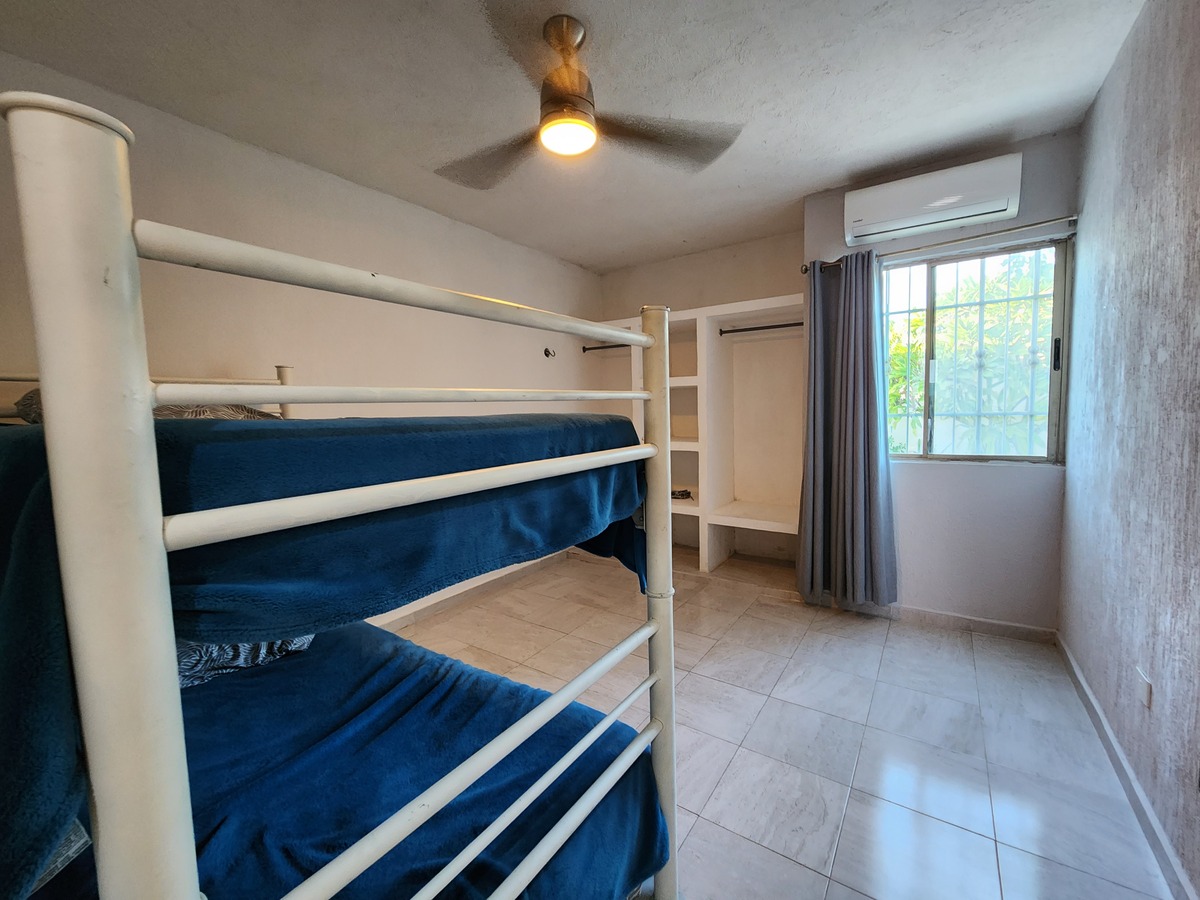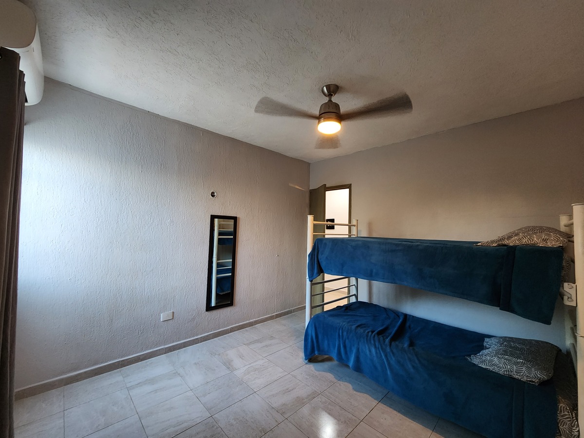 Recamara secundaria con closet vestido, literas , aire acondicionado y ventilador,