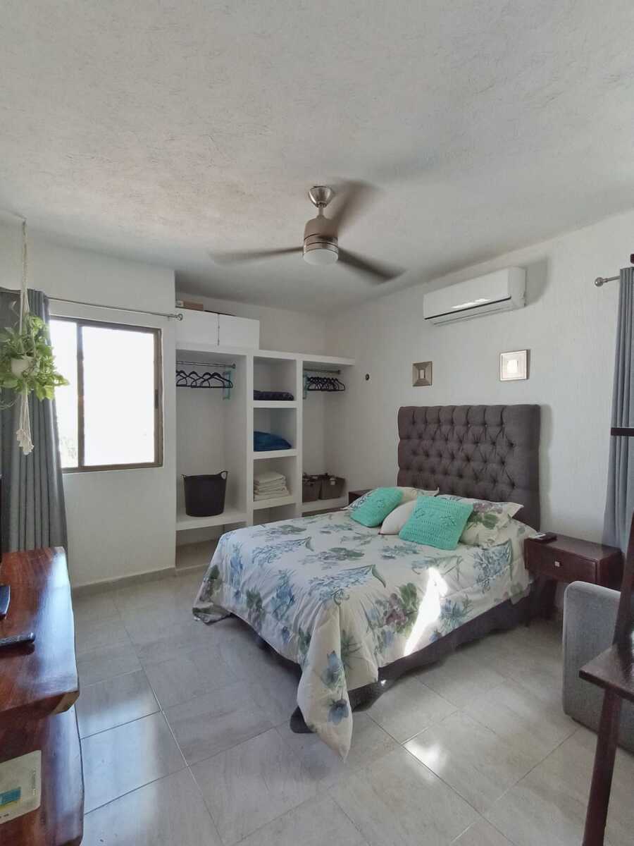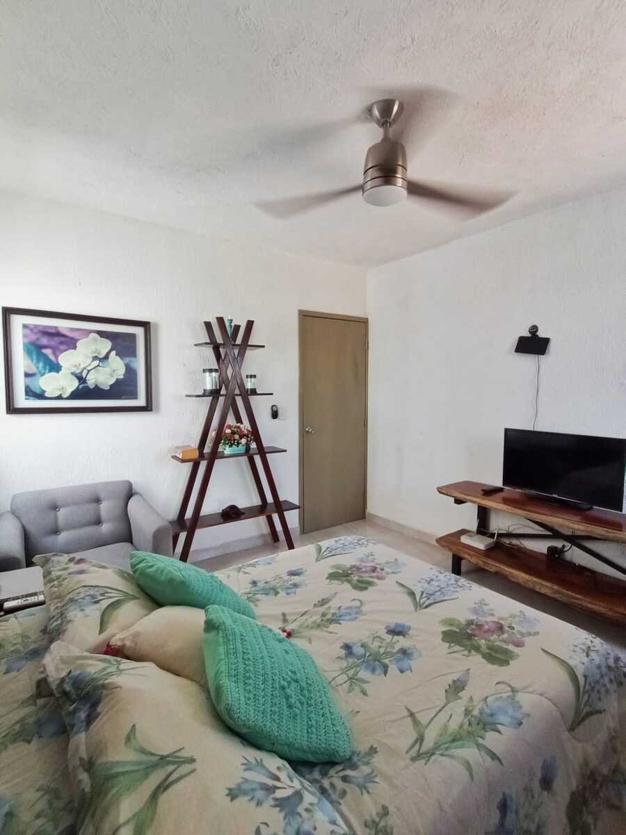 Recamara principal con cama matrimonial , closet vestido, smart tv empotrada en pared, ventilador y aire acondicionado.