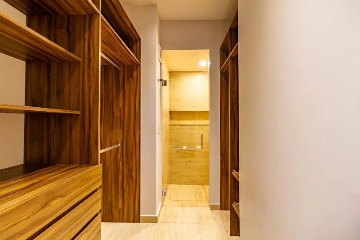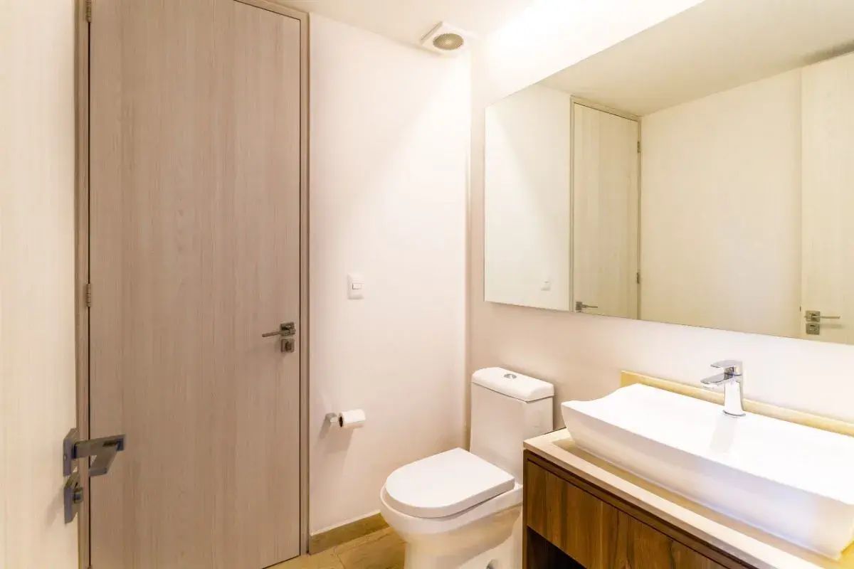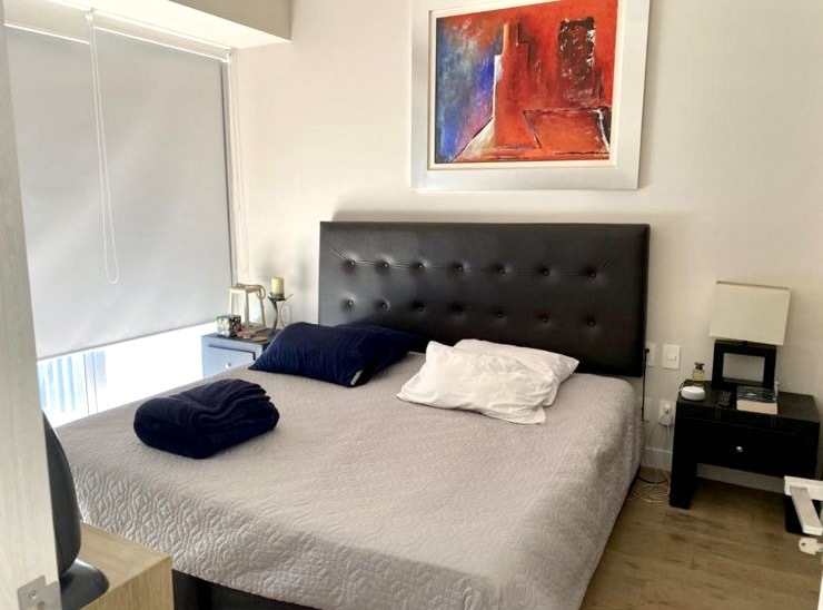 Estancia y recámara con balcón, cocina abierta equipada electrodomésticos, cubierta de granito y doble tarja, área de lavandería con centro de lavado, recámara de buen tamaño con cama king size y dos burós, excelente vestidor y baño con doble puerta, hacia el vestidor y hacia el área social.