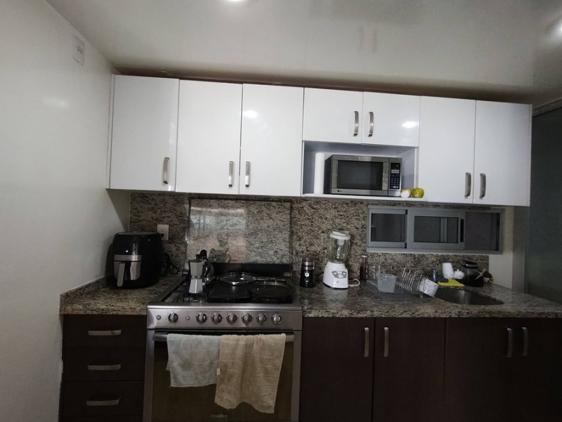 Cocina integrada con cubierta de granito, área de lavado con cancel divisorio y ventilación natural.