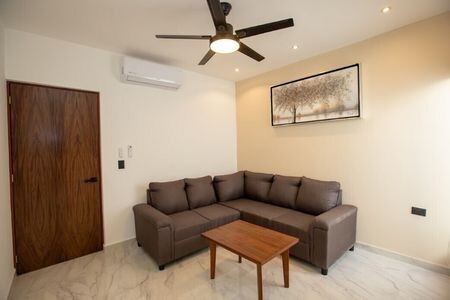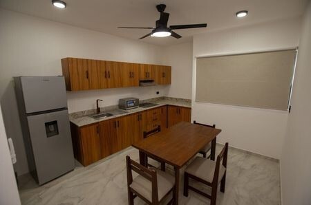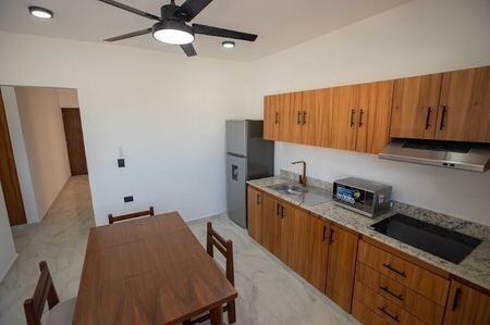 Se entrega equipado con ventiladores de techo, mini split , cocina con parrilla , horno de microondas y refrigerador.