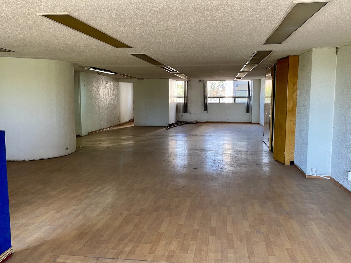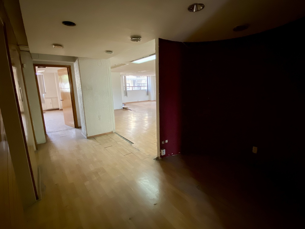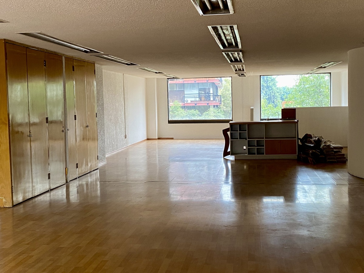 Este escritório está no 2º andar, tem 120 metros quadrados de área, é composto por um amplo escritório grande, com 2 espaços independentes semi-fechados com vista para a Avenida Insurgentes Sur, e uma pequena área para cafeteria.
