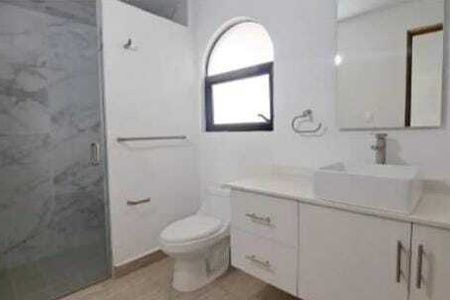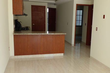 Dos recámaras, dos baños completos, área de lavado, una pequeña bodega, dos estacionamientos, portón eléctrico, cámaras, cocina integral con isla, sala-comedor, terraza con vista a la alberca