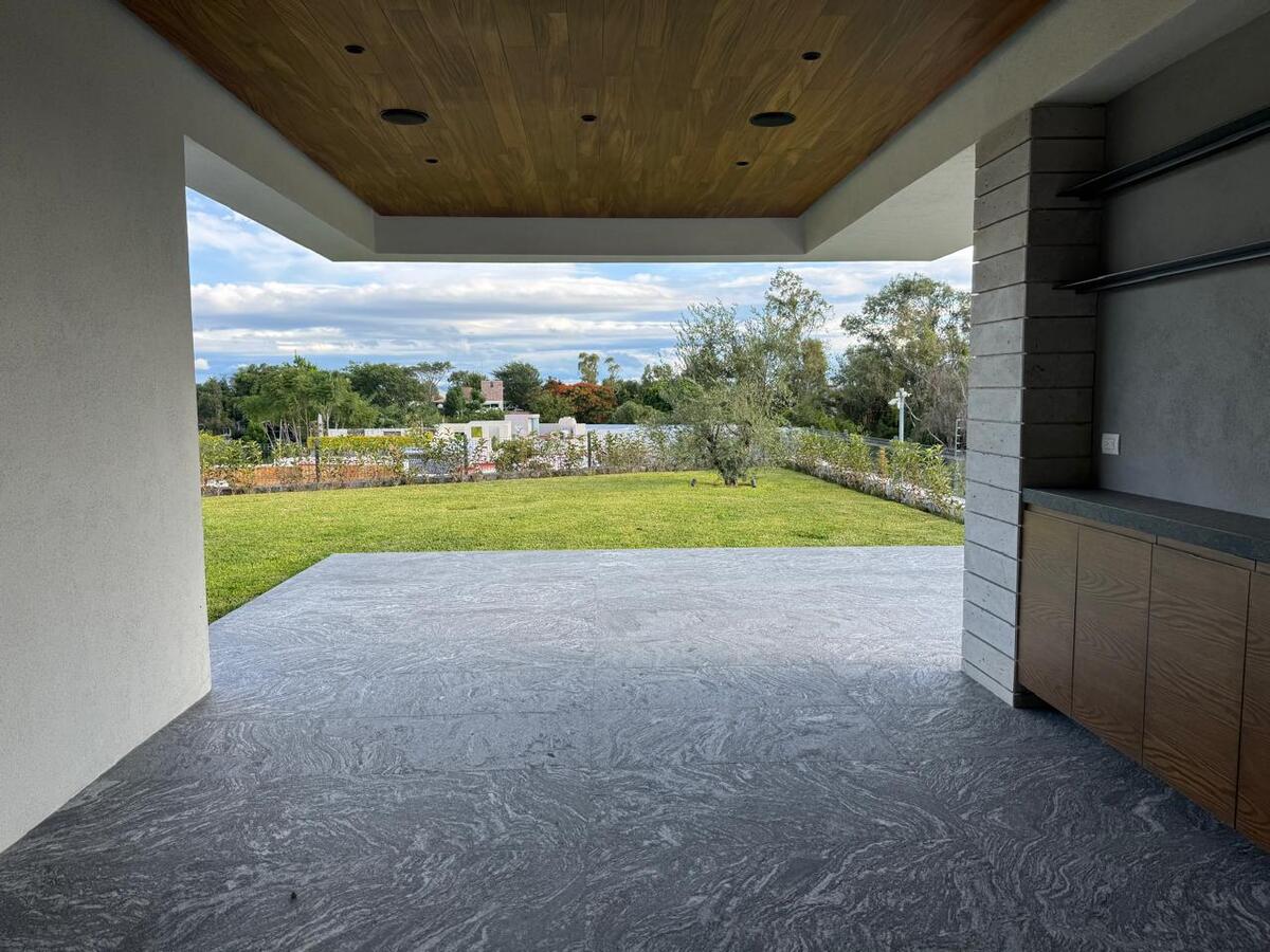 Bar con barra de granito, área para billar, cine, terraza conectada al jardín principal, recámara de visitas o estudio con baño completo y medio baño adicional.