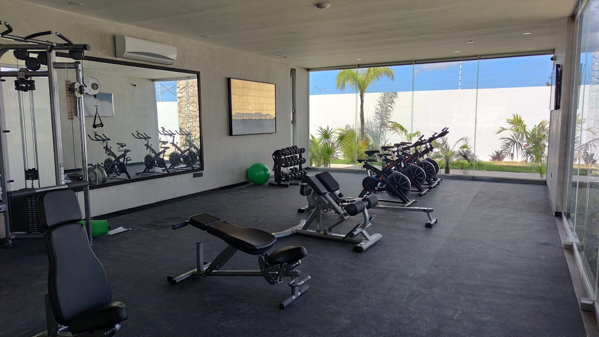 Gimnasio equipado y salón de masajes.