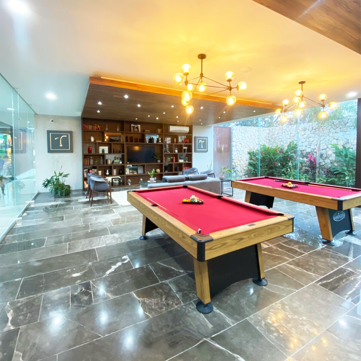 Salón de juegos con mesas de billar
