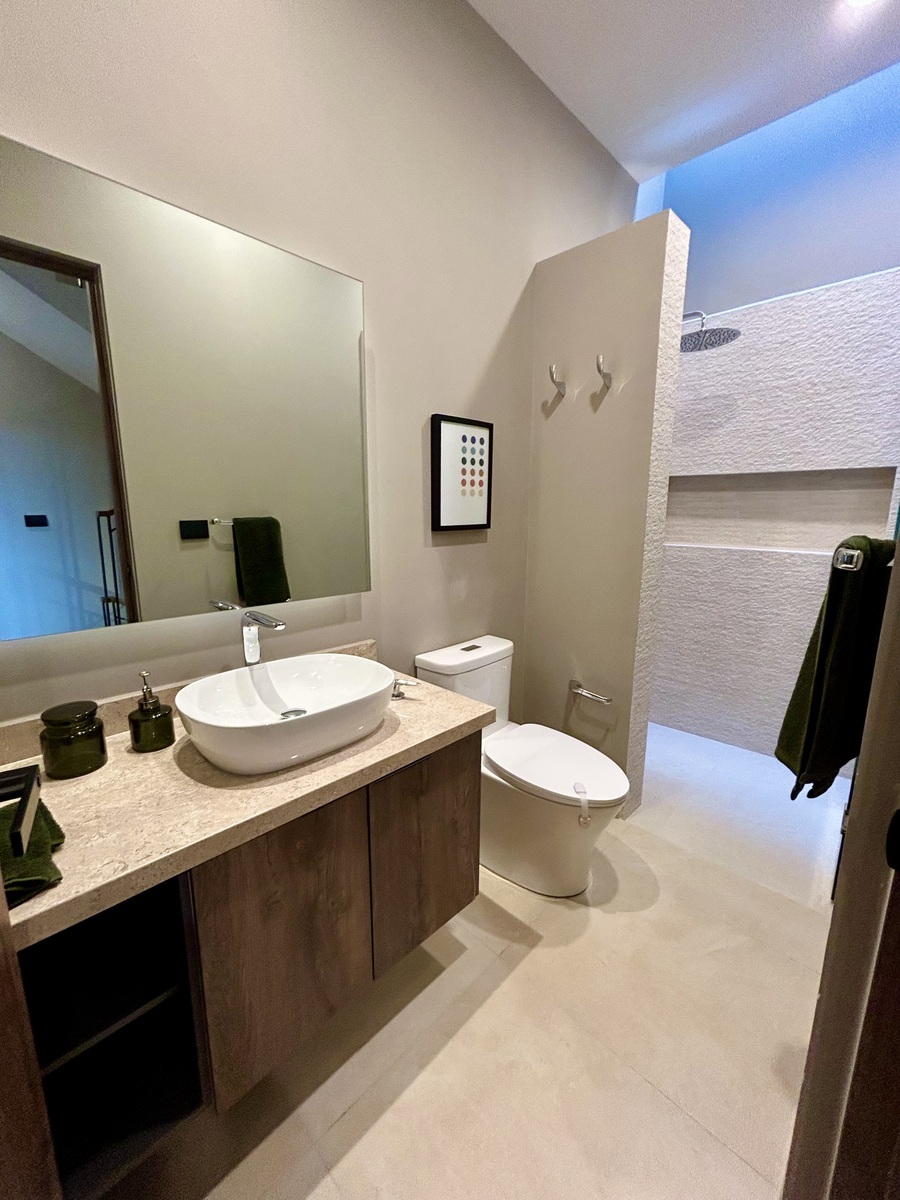 - Planta media: 3 recámaras; la principal con baño completo, 1ª recámara secundaria con closet y baño completo, 2ª recámara secundaria con closet y baño compartido.