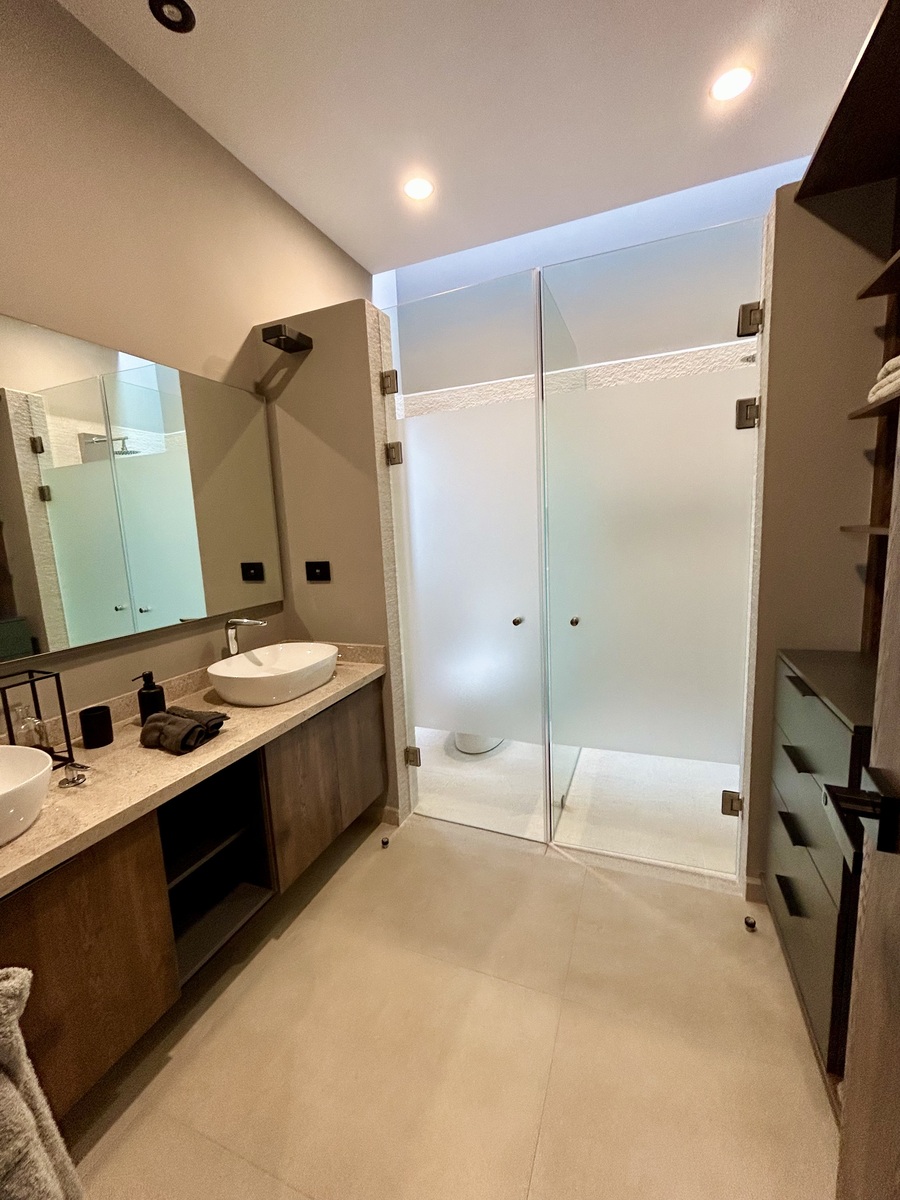 - Andar do meio: 3 quartos; o principal com banheiro completo, 1º quarto secundário com closet e banheiro completo, 2º quarto secundário com closet e banheiro compartilhado.