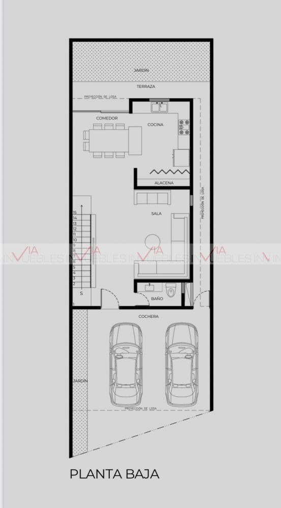 Planta Baja: cochera doble, baño de visitas, sala, comedor, amplia cocina y patio.