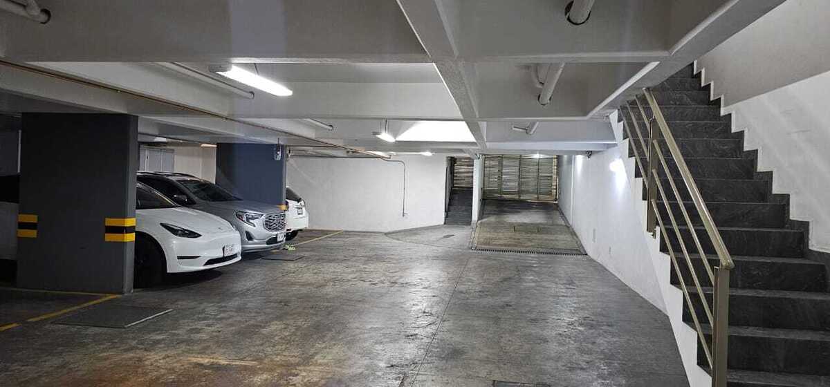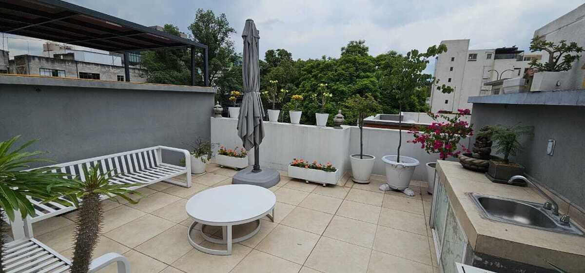 Cuenta con un roof garden de casi 27m2 con vista arbolada preciosa, así mismo 2 estacionamientos techados uno al lado del otro y bodega.