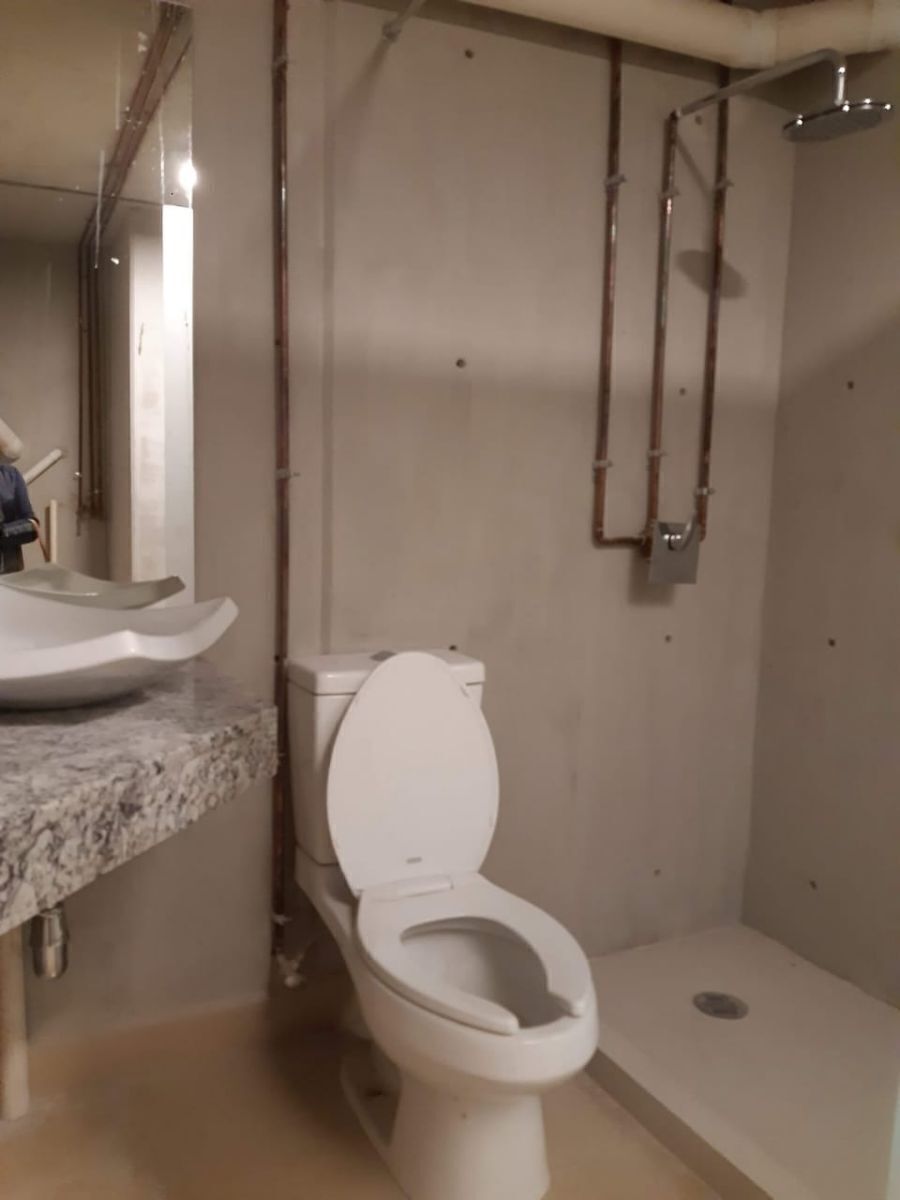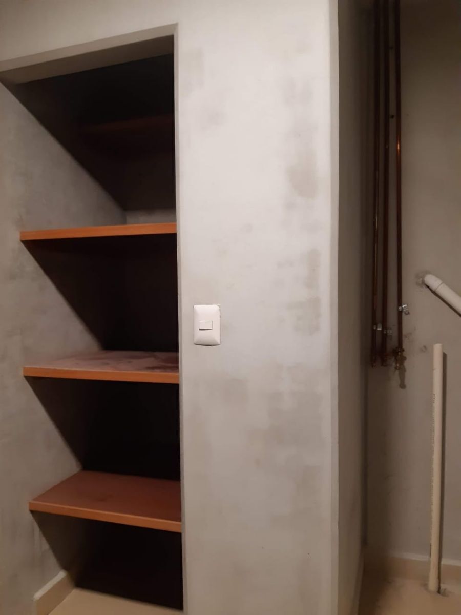 O apartamento tem uma área grande com banheiro completo na parte inferior do apartamento que pode ser usada como escritório.