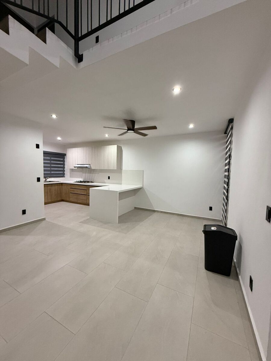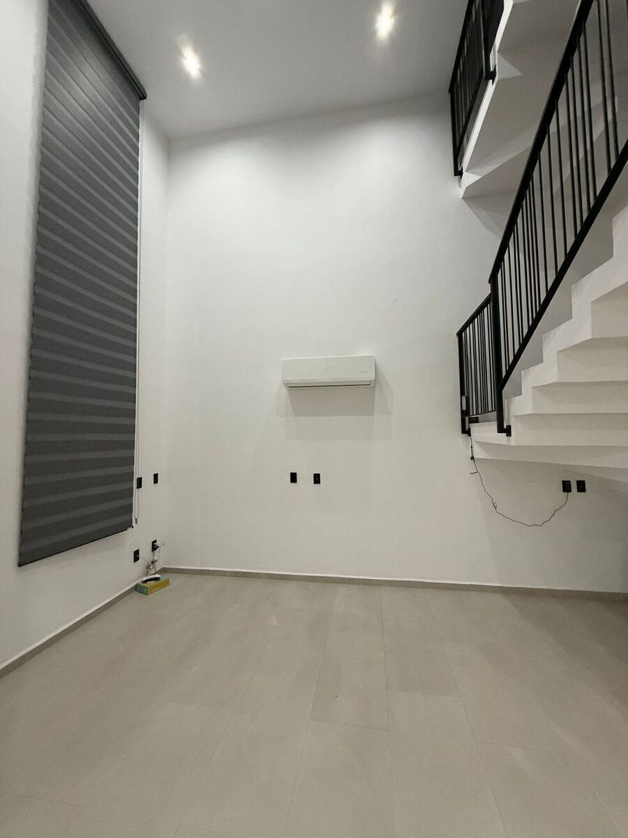 Tiene sala a doble altura, comedor y cocina integral (con estufa y campana y barra)