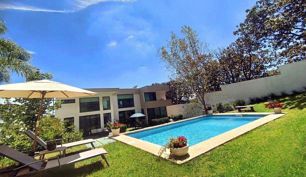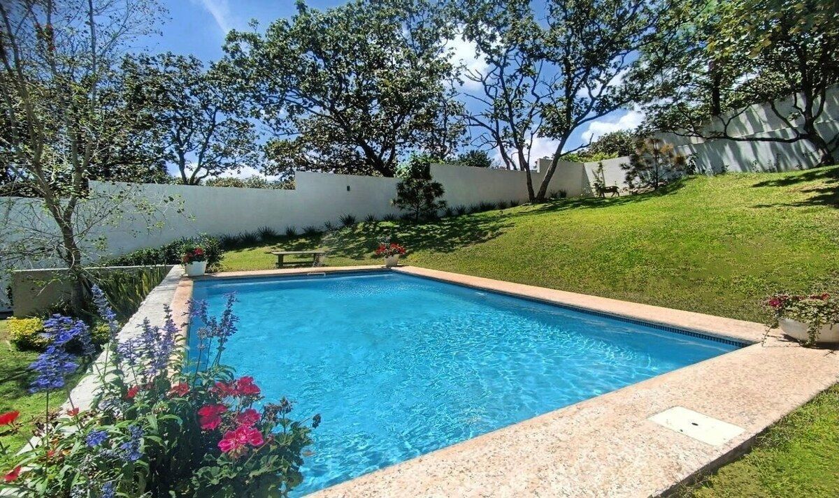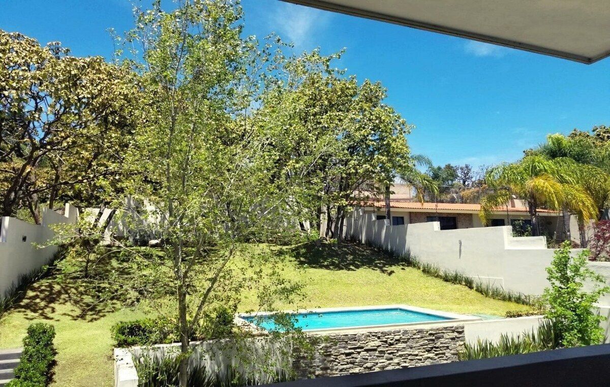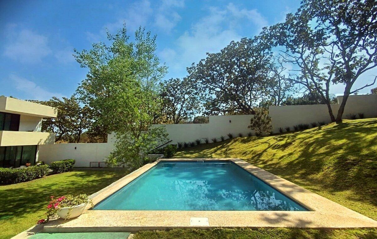 La alberca está ubicada en la parte media del jardín y tiene vista muy linda hacia la casa