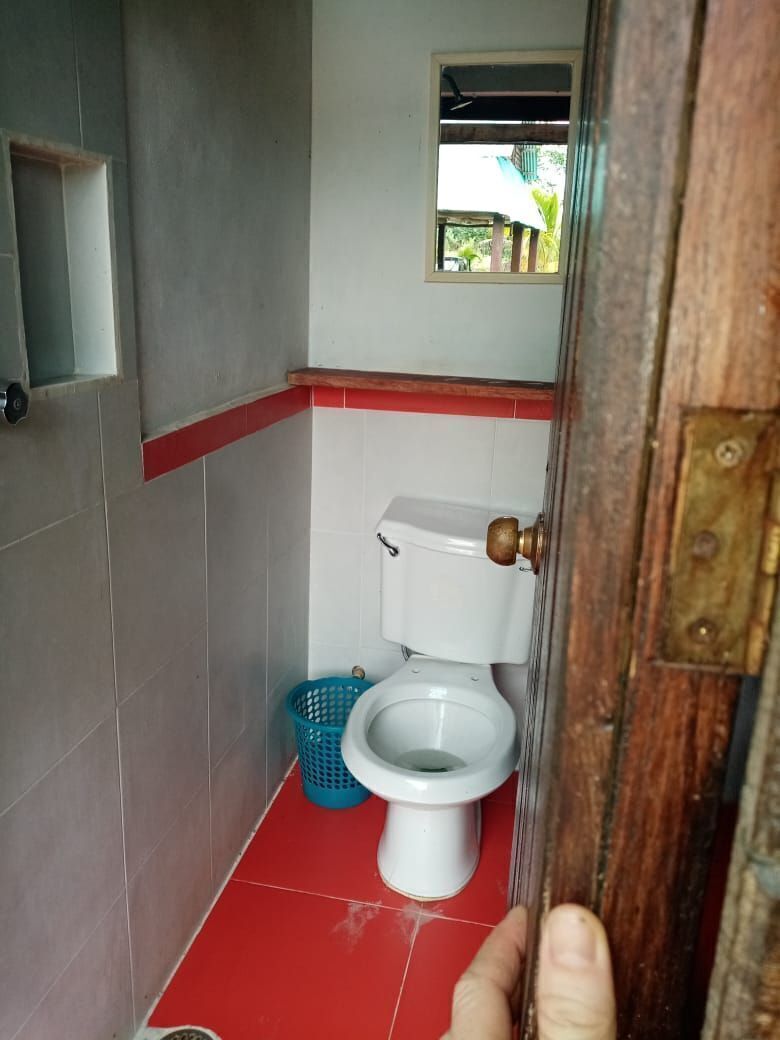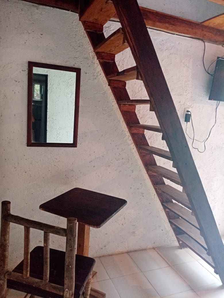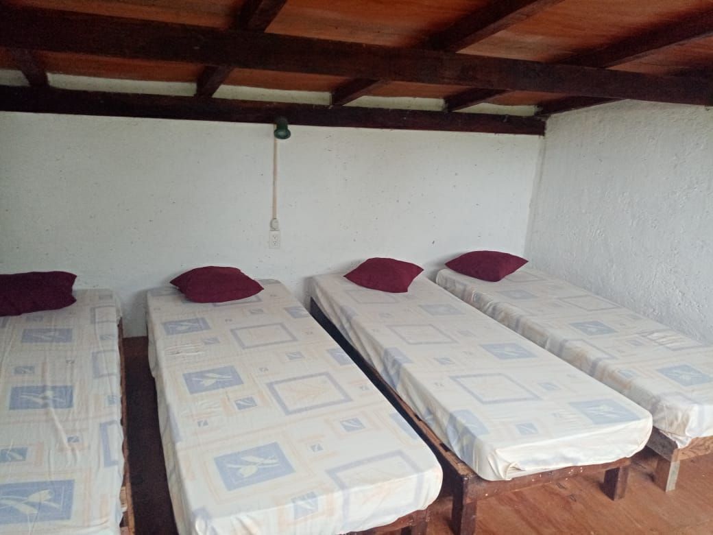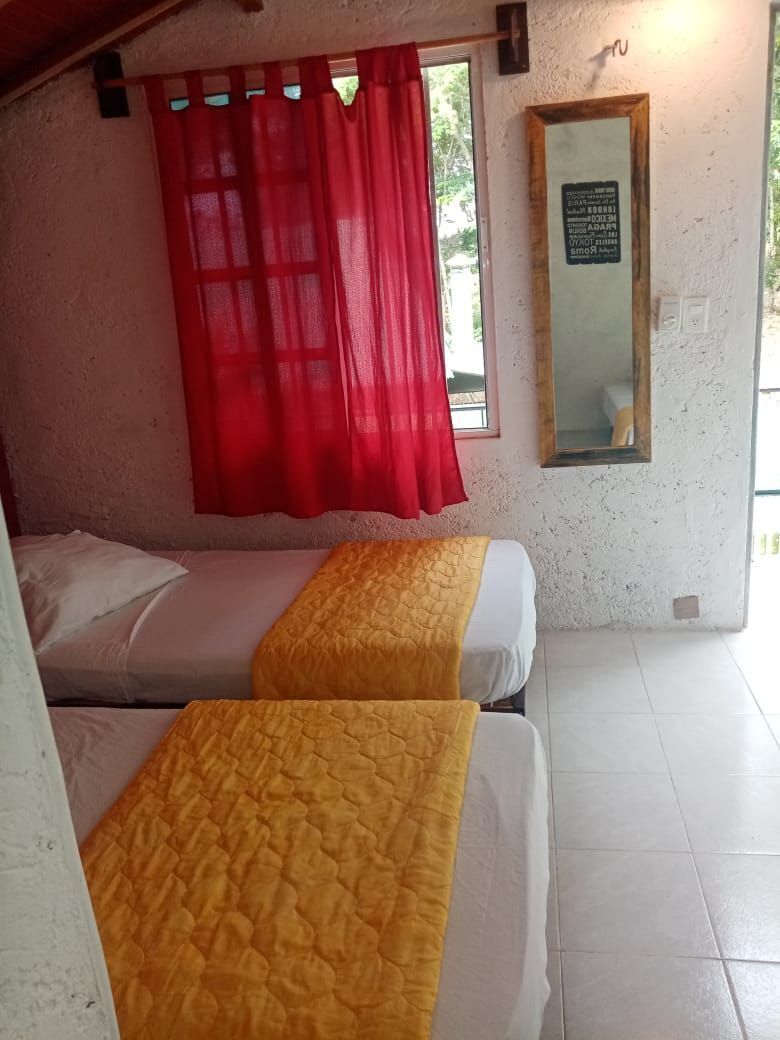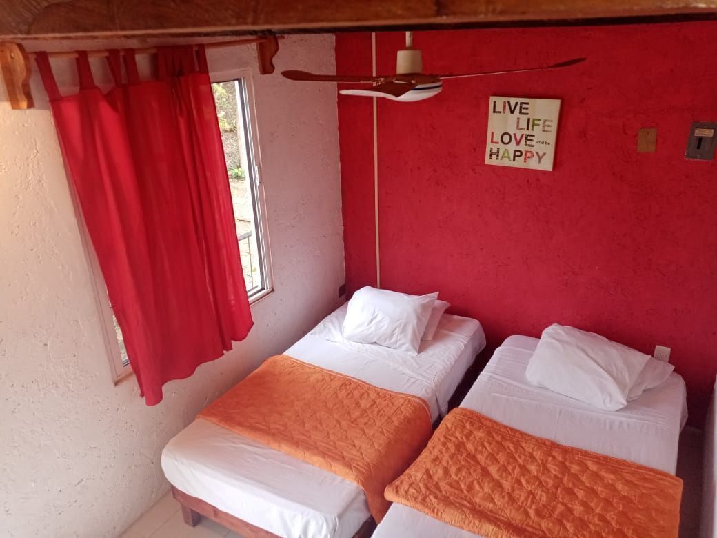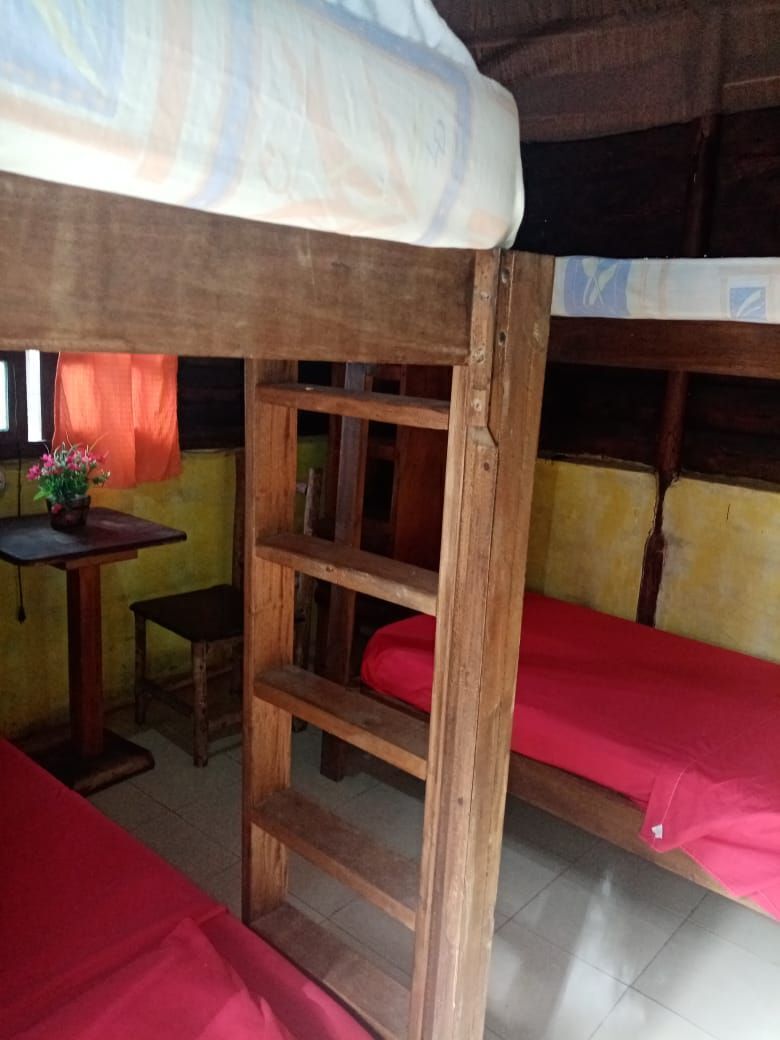 -1 Bungalow: se encuentra en segunda planta, el mismo posee 2 plantas con piso intermedio en madera. tiene 4 x 4 mts abajo y arriba. Total de metros cuadrados: 32 incluyendo el baño privado con todos los servicios, agua fría y caliente. Puertas en madera. Equipado con 6 camas inviduales con colchones, sabanas y colchas. 2 Tvs. 1 de 32” de Led y una de 21”. Mueble para ropa, ventilador de techo y de pie, Mosquiteros. 4 ventanas y una puerta. Techo delamina pintada forrada por dentro con triplay y aislante interno.
