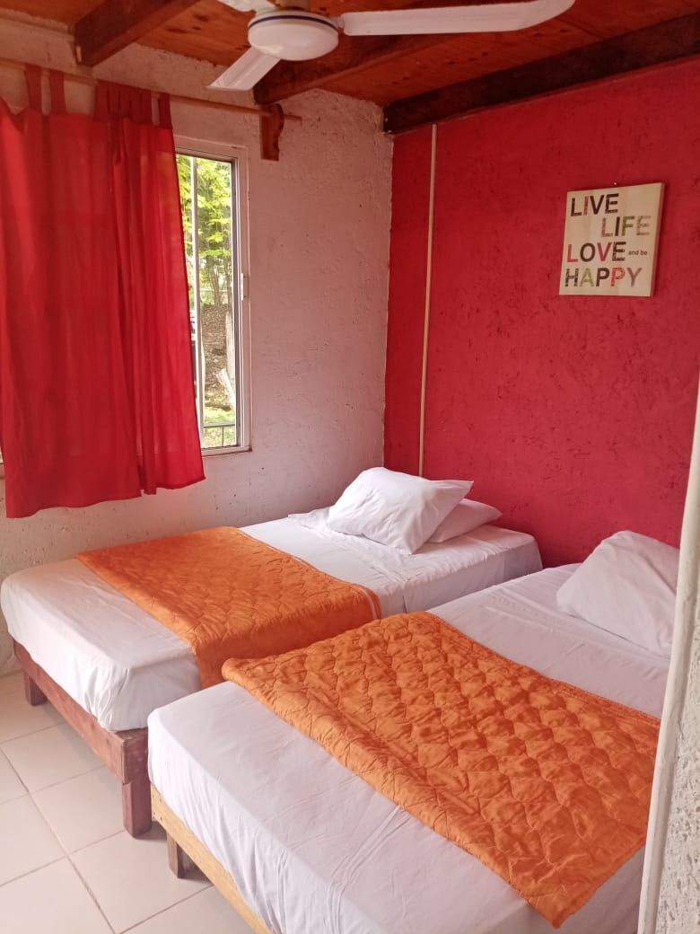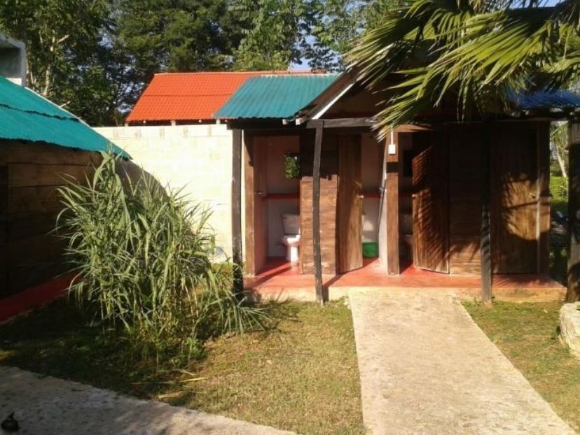 -2 Cabañas con techo de guano de 4 x 4 mts con piso de cerámico y paredes de block y madera duradera, Posee una ventana con mosquitero y una puerta. Equipada con 2 literas, mueble para ropa, ventilador, Tv de 21”. Mesa afuera con bancos para 10 personas. Luz afuera y adentro
