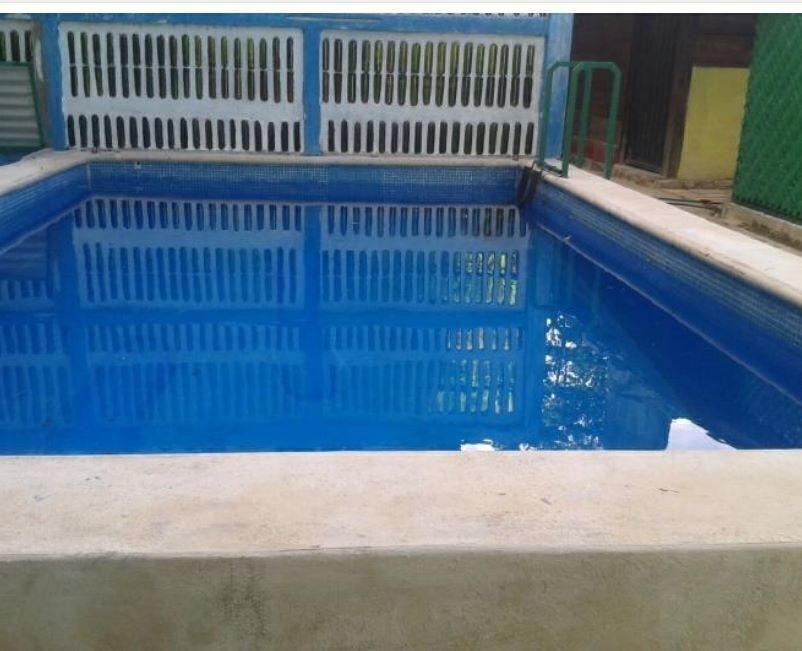 -Alberca de 6 x 3 mts x 1.60 de profundidad con boba y filtro para el piso. La alberca es de material con venezianas en la parte superior. Bomba para vaciado, filtrado y para mandar agua a cascada en pared echa con botellas que dan el reflejo por la noche en el agua. La pared que delimita la alberca de los cuartos es de 8 mts. X 2. 5 mts de alto echa con botellas. La alberca está cercada con maya y cinta de plástico en color verde. 2 puertas de hierro con maya y cinta verde. La alberca tiene escalera removible y tapas de lámina con candado para que no entre basura cuando no se usa. Luz en el área de alberca y piso de cemento alisado alrededor para colocar camastros. Posee una mesa y 3 camastros.