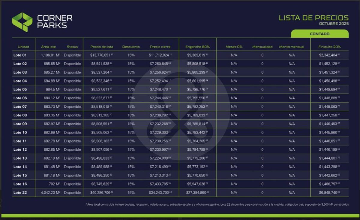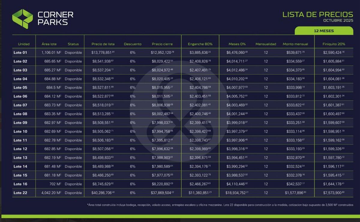 En venta lotes industriales en Gobernador Curiel, dentro del desarrollo CORNER PARKS en San Pedro Tlaquepaque, Jalisco. Oportunidad de inversión en un parque industrial con 22 lotes de 600 a 700 m2 y uno de 4000 m2. Proyecto en marcha, entrega del lote en 6 meses para construcción de bodega. Posibilidad de cotizar construcción con el desarrollador. Precios de contado y financiamiento a 12 meses disponibles. Ubicación estratégica en Tlaquepaque Centro, con fácil acceso a vías principales. Ideal para empresas en busca de terrenos para desarrollo industrial.
