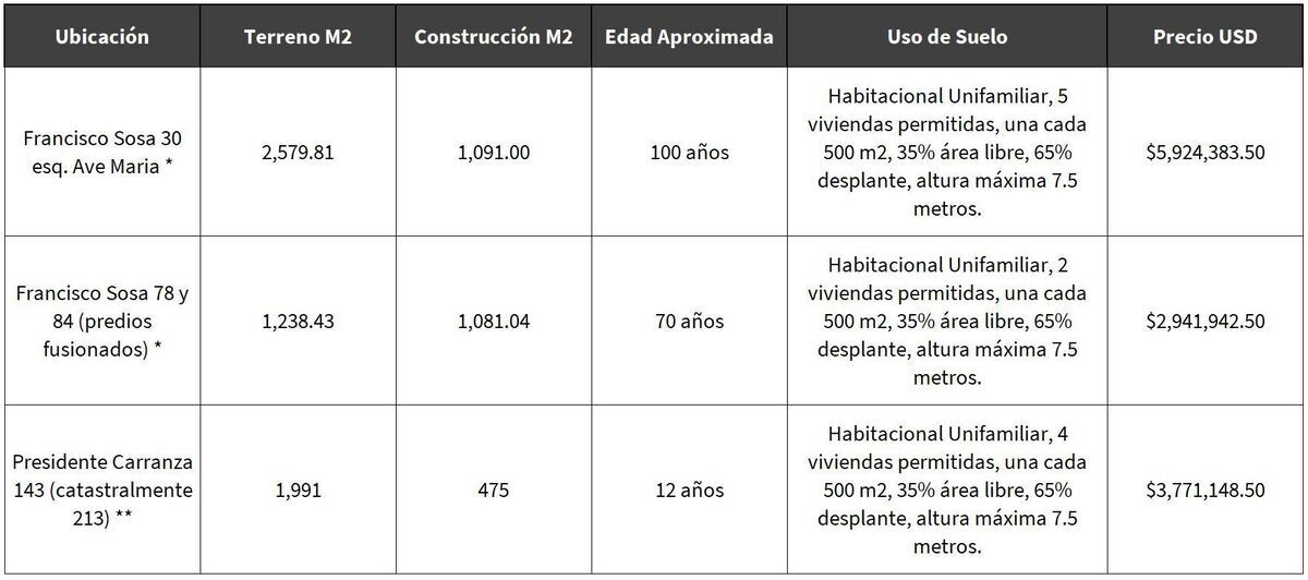 2. La adquisición de los dos inmuebles con frente a Francisco Sosa, con la opción de fusionarlos y construir hasta 8 viviendas.