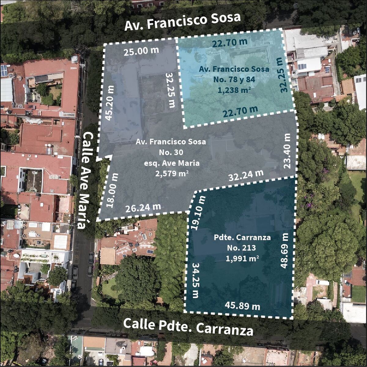 Nota: La propiedad con frente a Presidente Carranza no se vende de manera individual, y se condiciona su venta a la compra de las 3 propiedades.