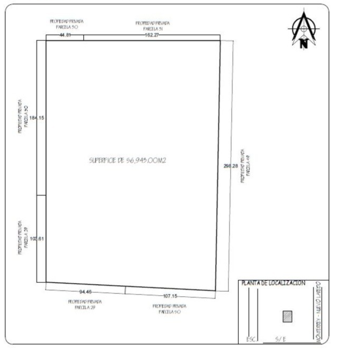 Um terreno de 56.943 m² é oferecido localizado no Ejido San Juan del Mezquital, município de Salinas Victoria, próximo à Rodovia Monterrey–Novo Laredo, um corredor chave para logística e indústria.