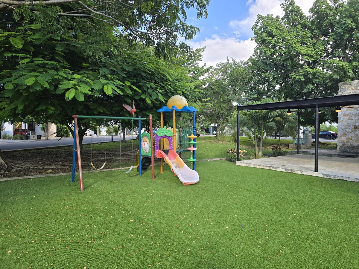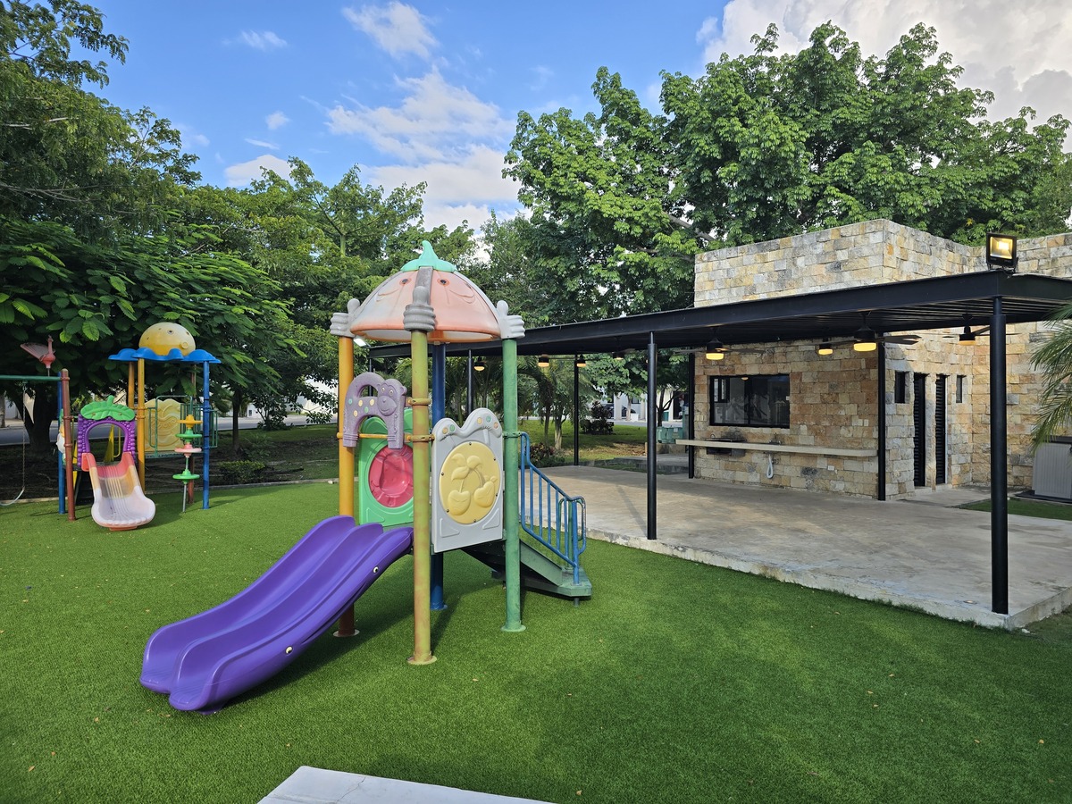 Ubicado en esquina alado de la fachada principal y frente a la amenidad de figura irregular de 9 m de frente abre a 12 m en el fondo y en su lado más largo de fondo es 24.36 m.