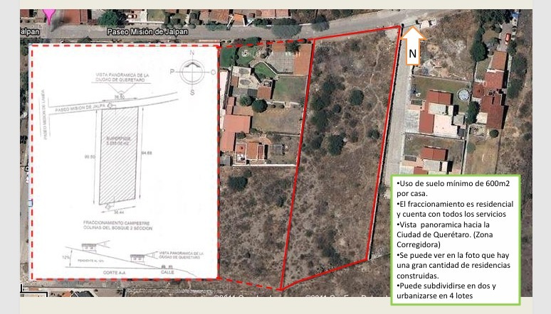 Terreno en VENTA de 3,258 m2 en Colinas del Bosque, con una vista hacia la Ciudad de Queretaro, Se puede subdividir en 2 y urbanizar en 4 lotes, uso de suelo habitacional minimo de 600m2 construccion de cada casa.