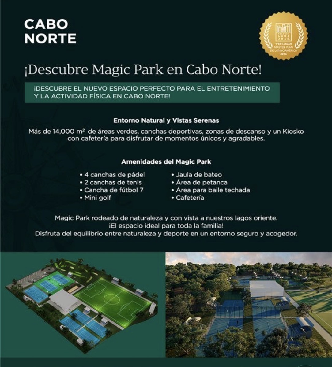 Pet park, parque acuático, parque para adultos y el fitness star, 5 kilómetros de recorridos verdes independientes a las calles y rodeadas de vegetación, lago principal y 3 lagos en su interior, zona para eventos, ludoteca con guardería, baby park, zona de diversión, centro cultura, salón de fiestas,