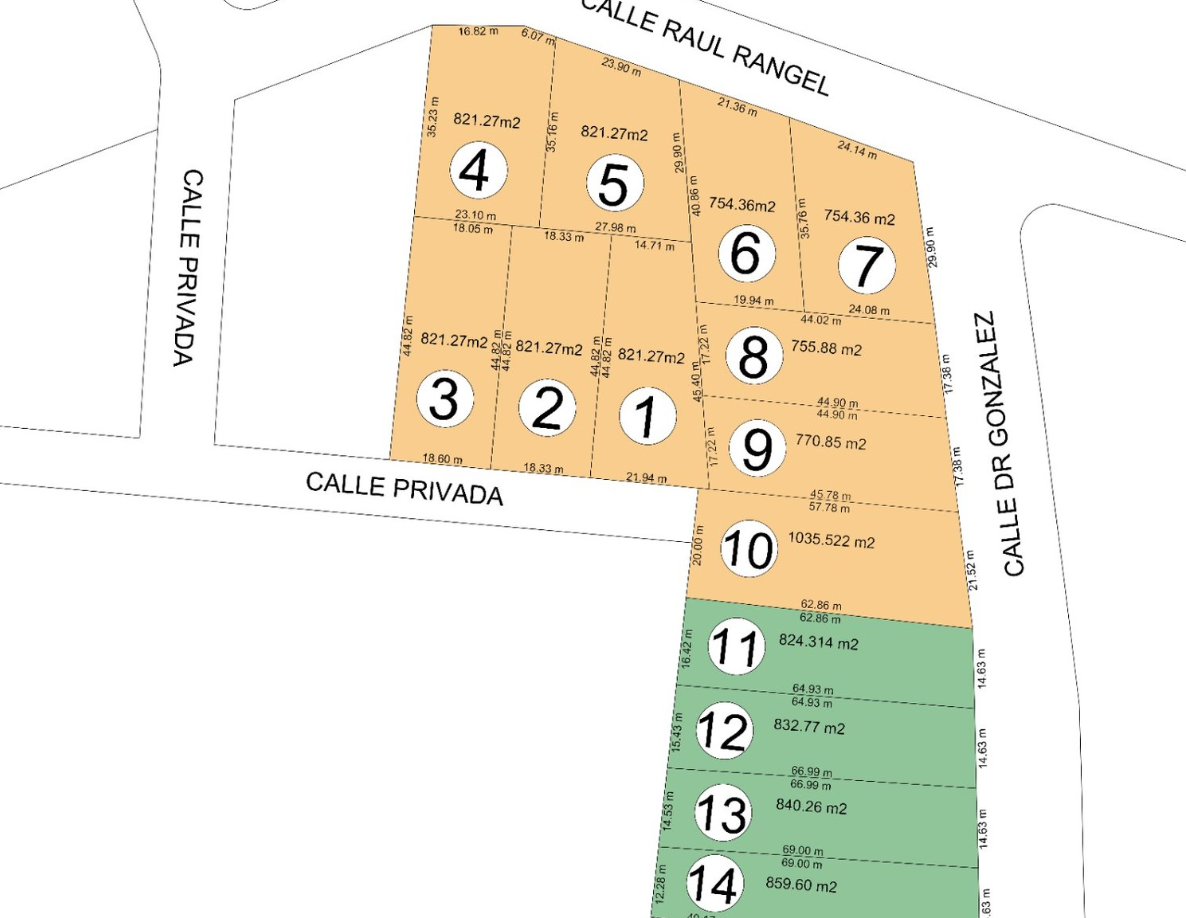Fraccionamiento residencial privado con 14 lotes y servicios de agua y luz.