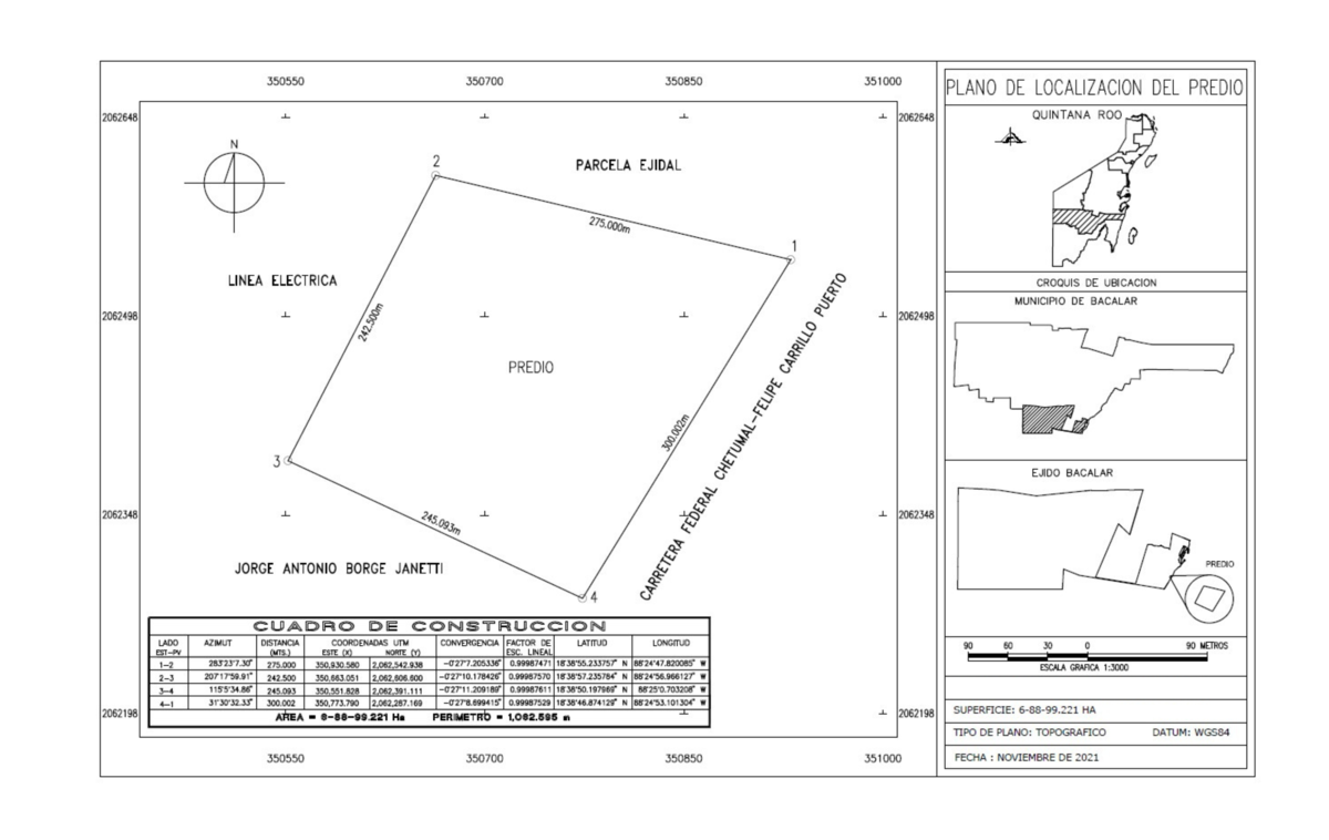 🚗 Com 300 metros de frente para a rodovia federal Chetumal-Bacalar, esta propriedade, com cessão de direitos, oferece alta visibilidade e fácil acesso, ideal para desenvolvimentos turísticos, hoteleiros, residenciais ou ecológicos. O lugar perfeito para atrair visitantes, investidores e aventureiros!