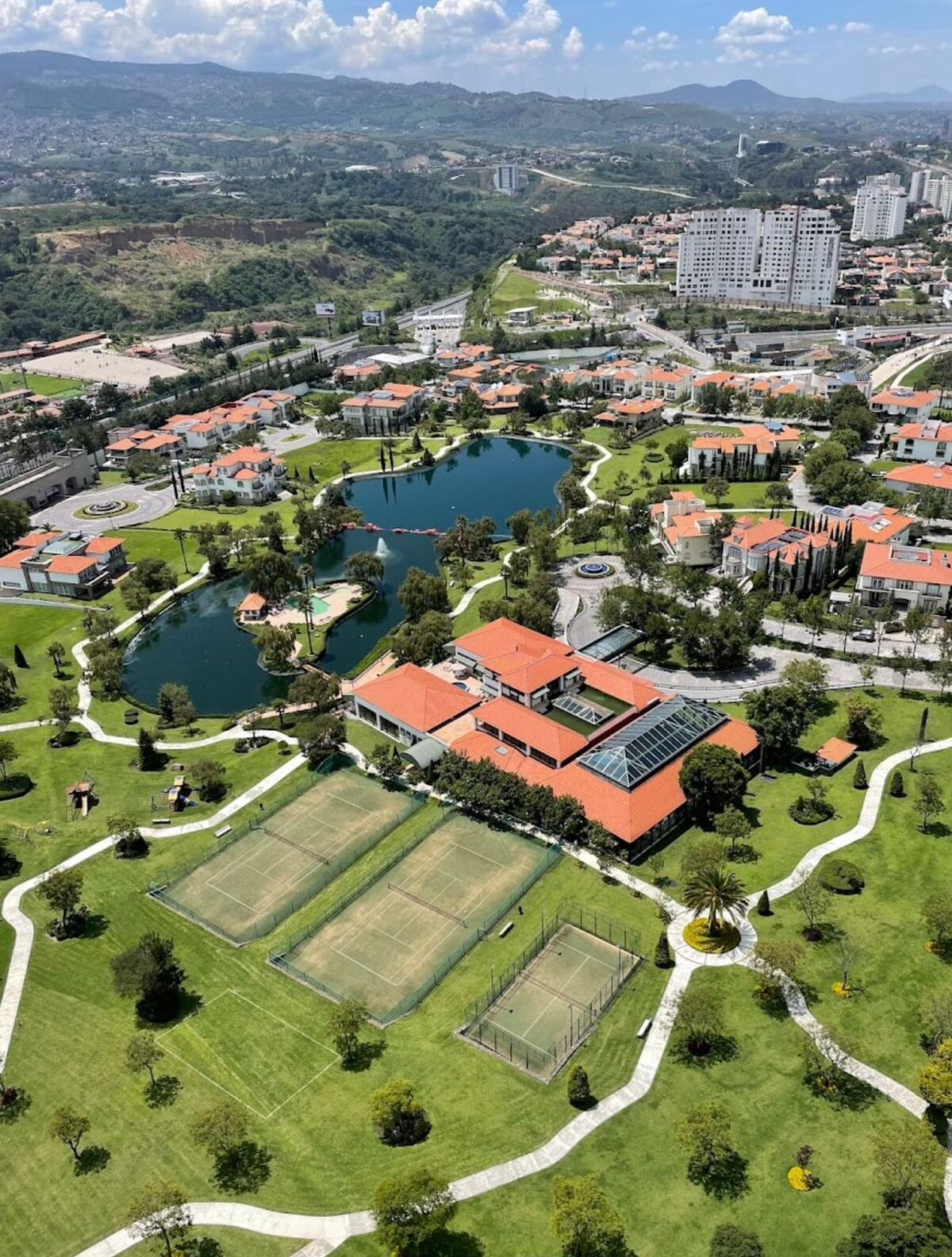 Cuenta con alberca, cancha de tenis, gimnasio, área de juegos infantiles y canchas de padel.