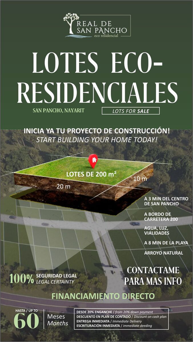 "¡Invierte en tu futuro en un paraíso natural! Estamos ofreciendo terrenos en venta dentro de un proyecto ecoturístico exclusivo, ubicado a solo 5 min del pueblo de San Francisco Nayarit, disfruta de la belleza de la naturaleza y la tranquilidad de este lugar, este fraccionamiento es el único en su tipo en la zona que te ofrece financiamiento directo, escrituración al concluir el crédito, casa club, alberca agua luz, entrada monumental calles empedradas y un entorno seguro y tranquilo que garantiza tu inversión, además de la cercanía de playas y pueblos turísticos de la Riviera Nayarit y puerto Vallarta.