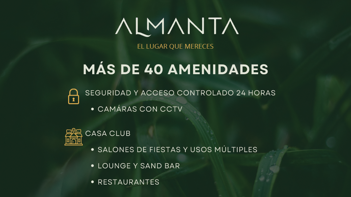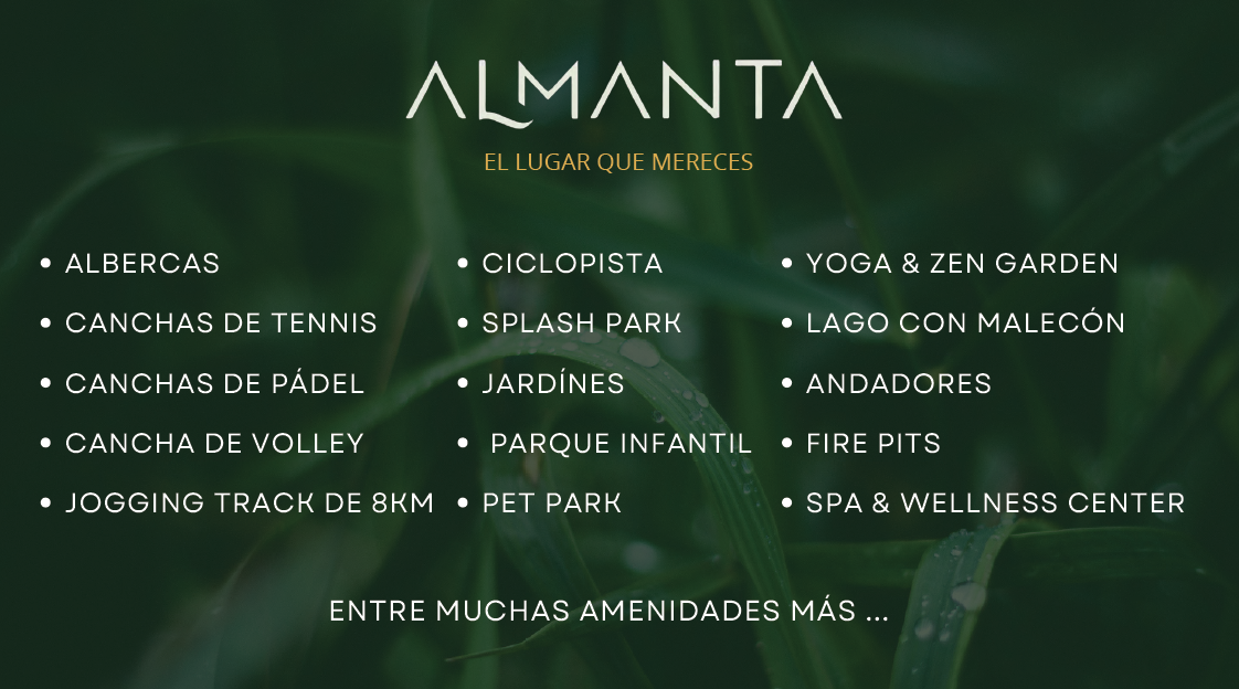 Además, al formar parte de Almanta, se accede a más de 40 amenidades generales, entre ellas: jogging track de 8 km, ciclopista, canchas de tenis y pádel, splash park, spa & wellness center, lago con malecón, jardines, áreas zen y espacios diseñados para el bienestar de toda la comunidad