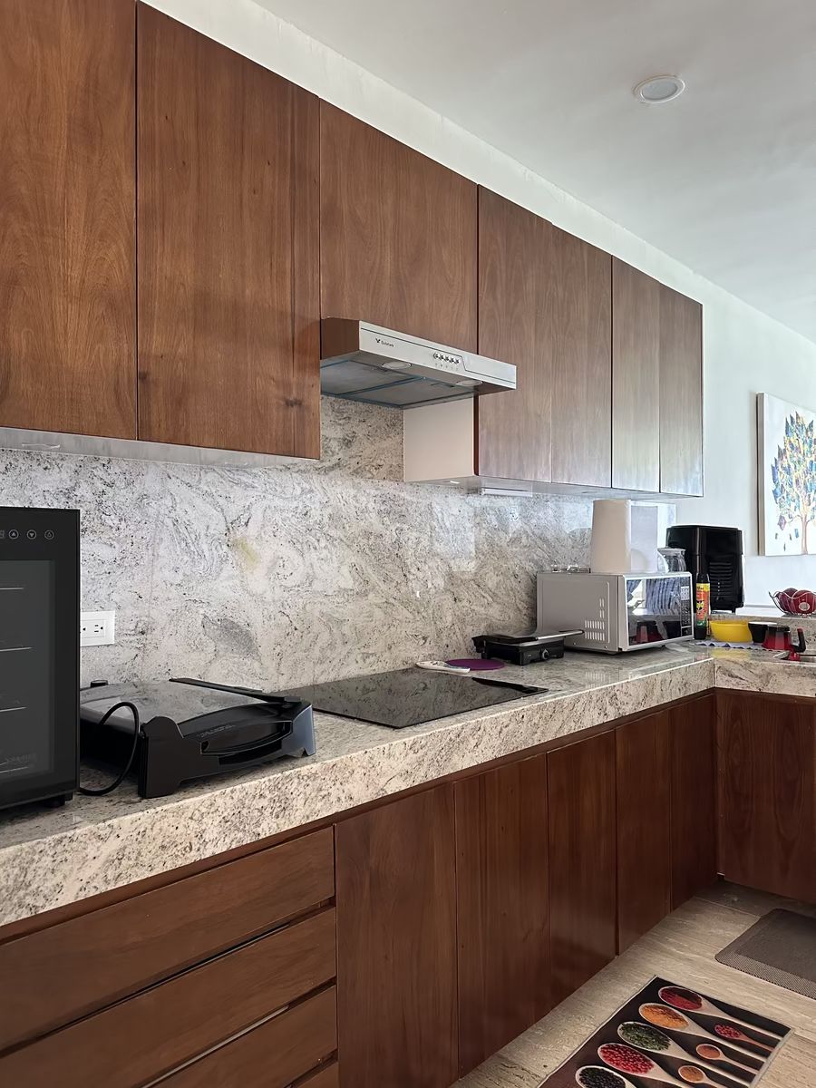 -Cocina con isla desayunadora y parrilla de inducción a doble altura.