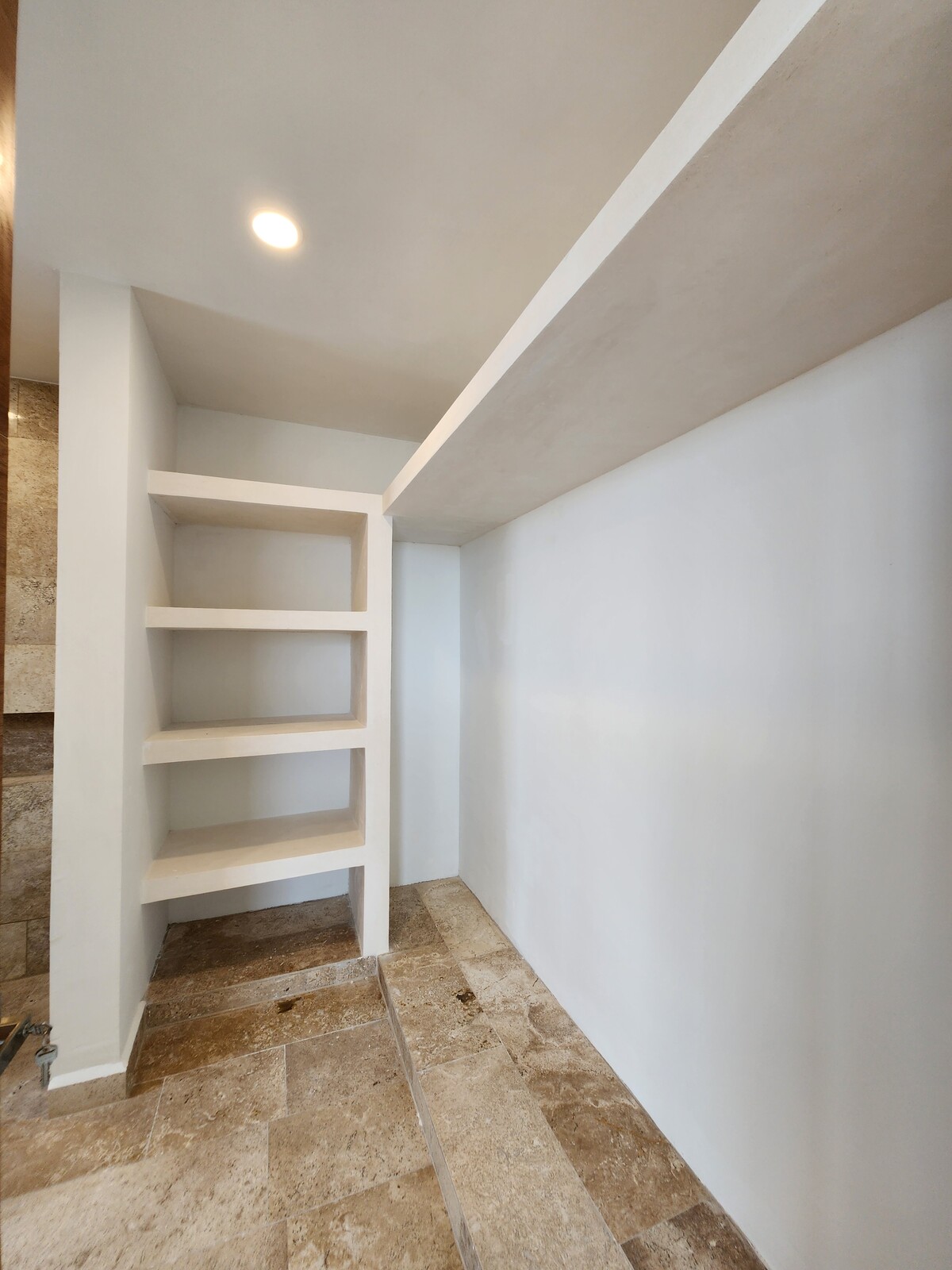 Quarto com área para closet de parede e banheiro