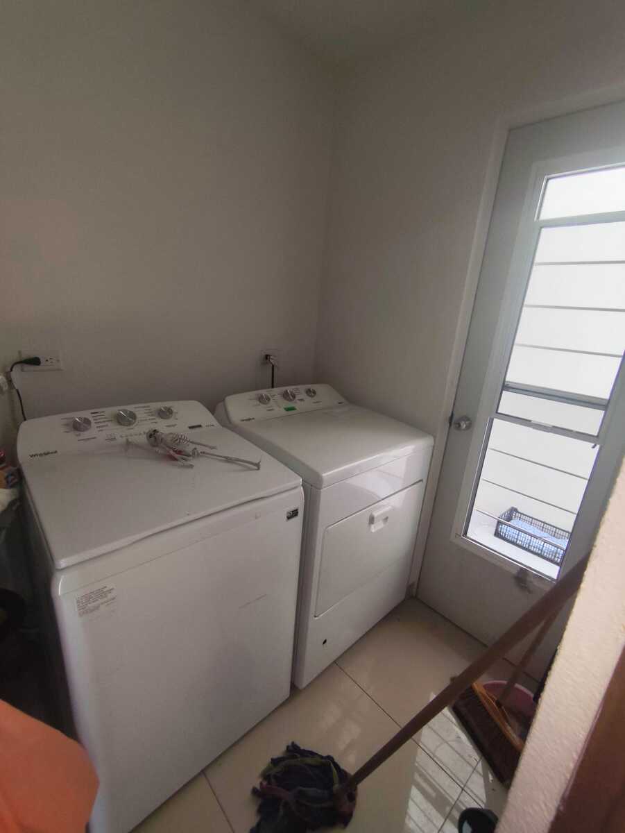 Planta baja con sala, comedor, cocina integral equipada, lavandería, medio baño, cochera techada para dos autos y patio amplio.