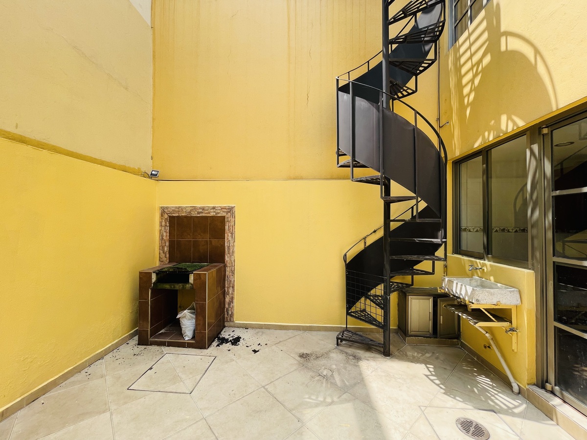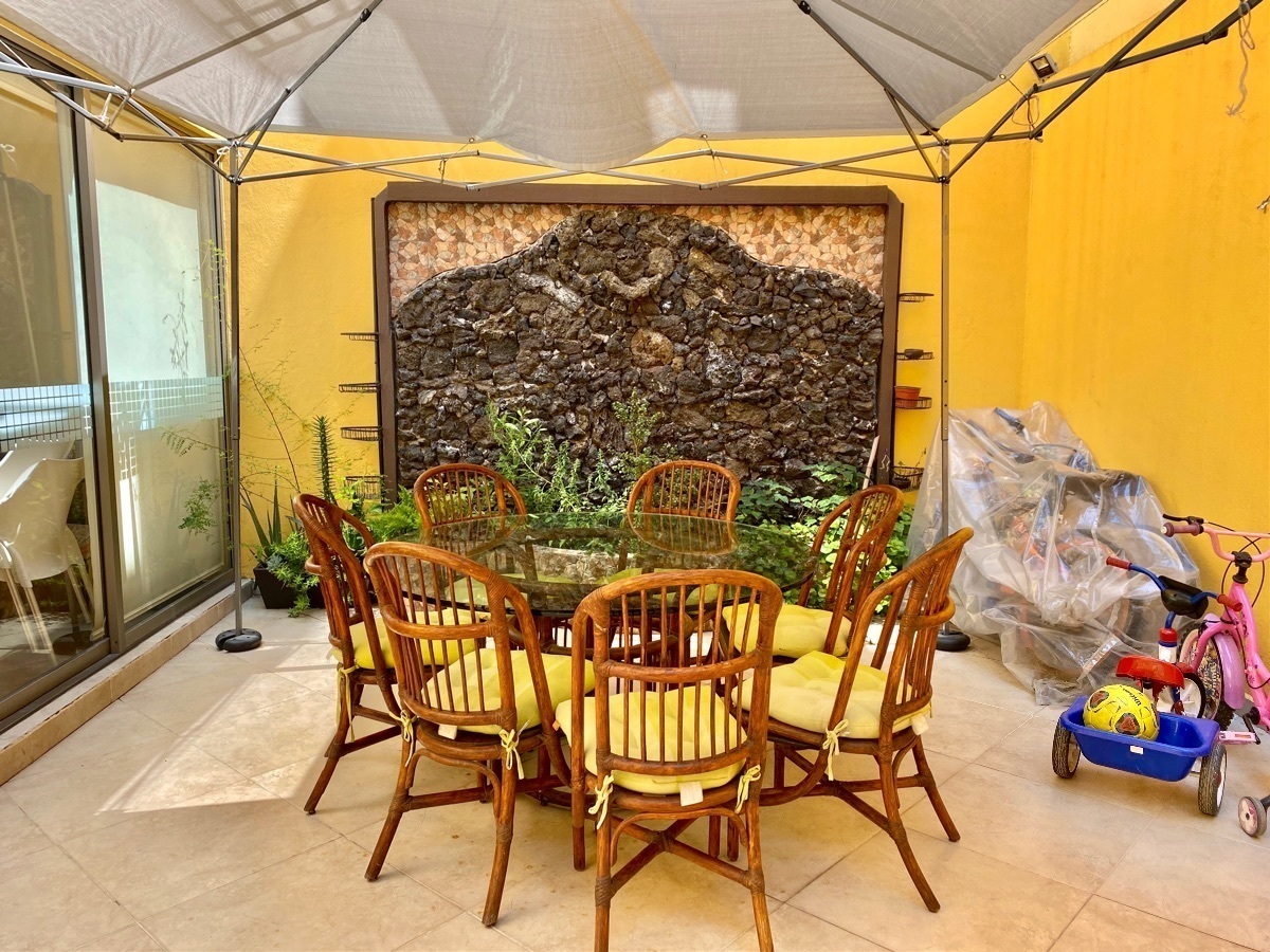 La casa cuenta con amplia sala comedor, cocina equipada, baño de visitas, estudio, todos espacios amplios y con mucha luz natural, con dos patios interiores, uno en la parte frontal y otro en la parte posterior con asador y fuente.
