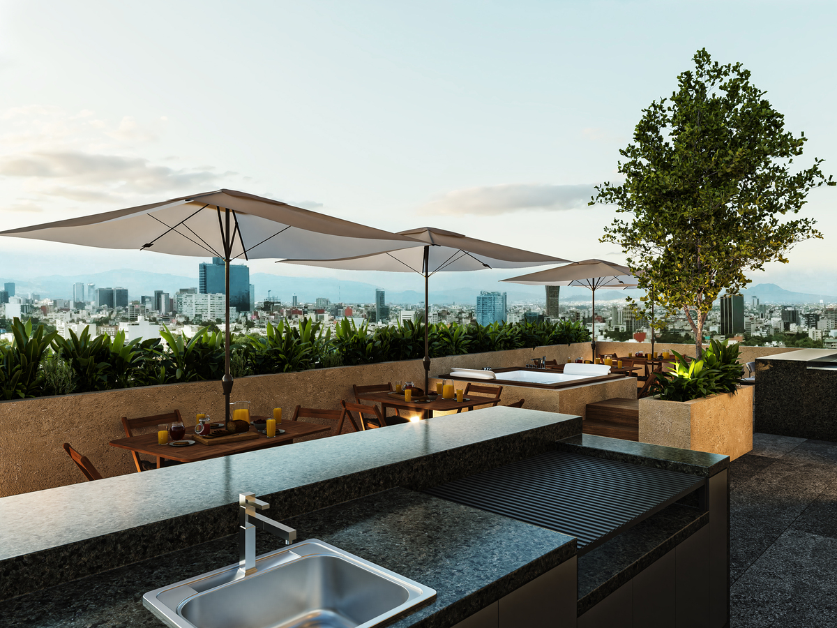 Áreas comuns com jardim na cobertura e espaços de convivência.