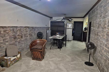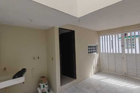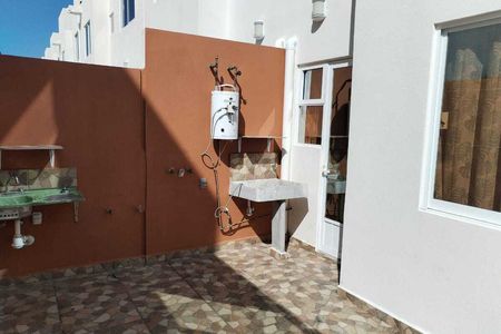 Garaje techado para un vehículo con portón eléctrico, área de recibidor o terraza interior, sala, comedor, cocina integral con barra desayunadora y mueble bar equipada con estufa y campana, recámara con clóset y minisplit, baño completo forrado con azulejos y equipado con accesorios de baño y cancel, amplia área de lavado techada con doble altura y amplio espacio ideal para alacena o bodega de almacenamiento.