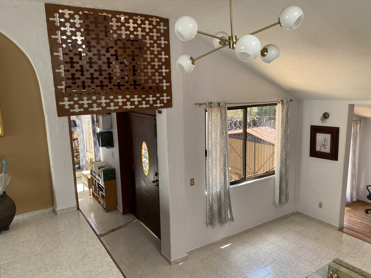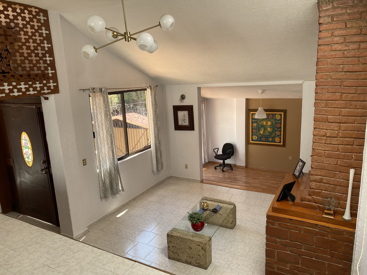 Primer nivel sala con chimenea, cuarto de TV. Estudio pequeño y medio baño de visitas.