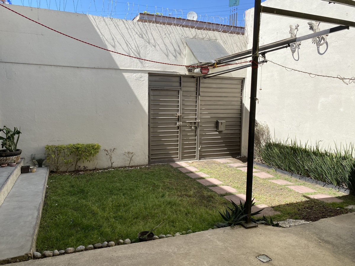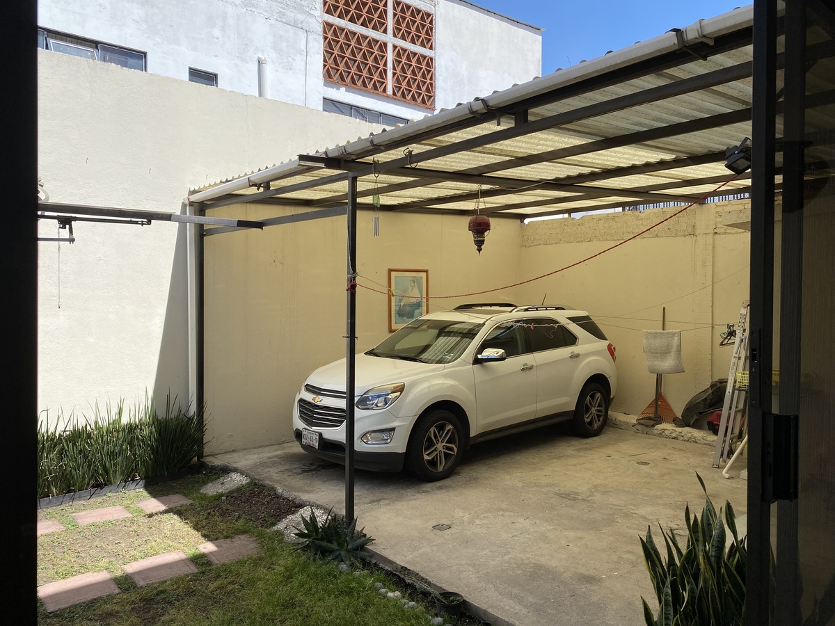 Jardín y patio techado con dos lugares de estacionamiento. Portón eléctrico.