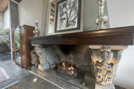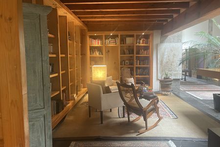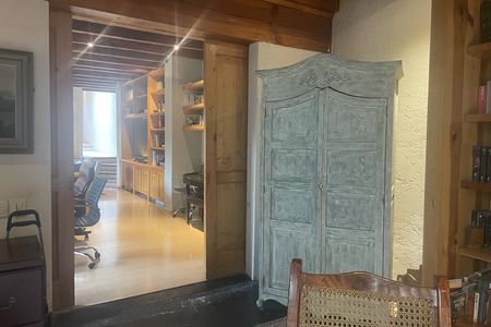 No primeiro andar encontramos a sala, a sala de jantar, a cozinha e a saída para o jardim; neste andar encontramos um escritório com sua lareira.