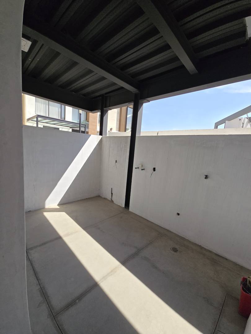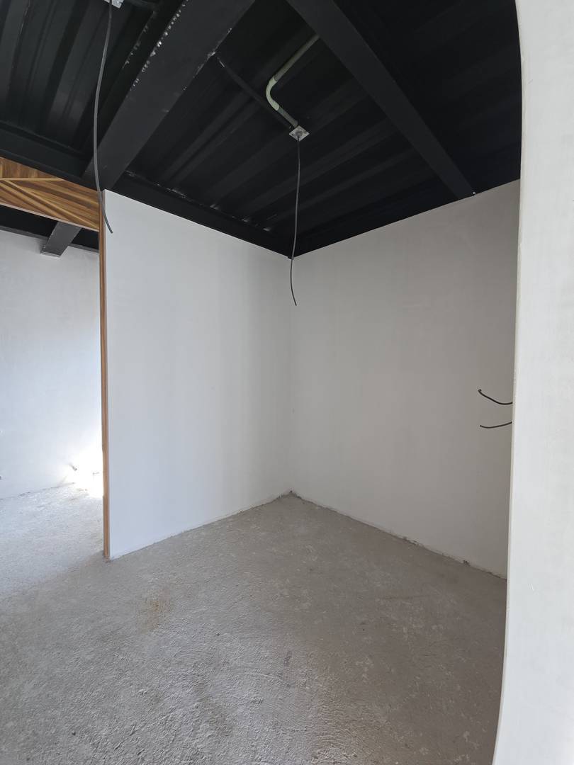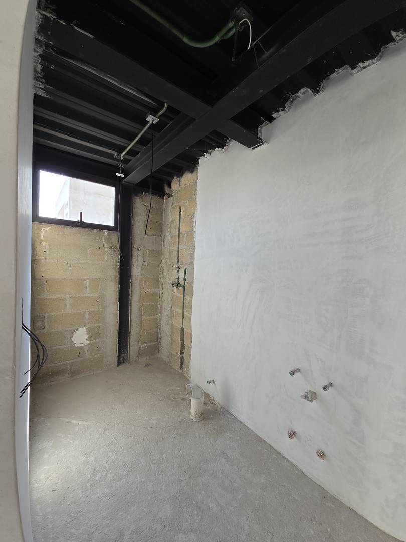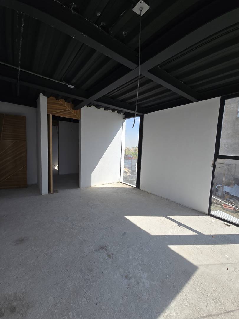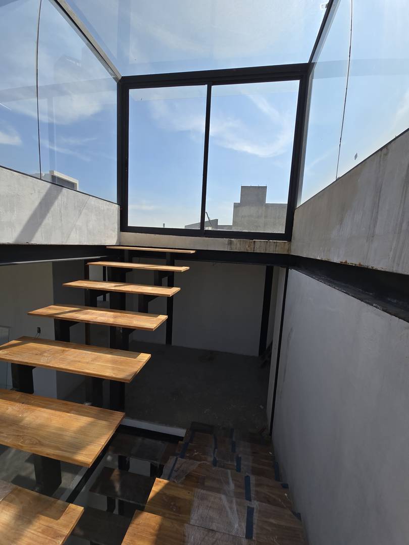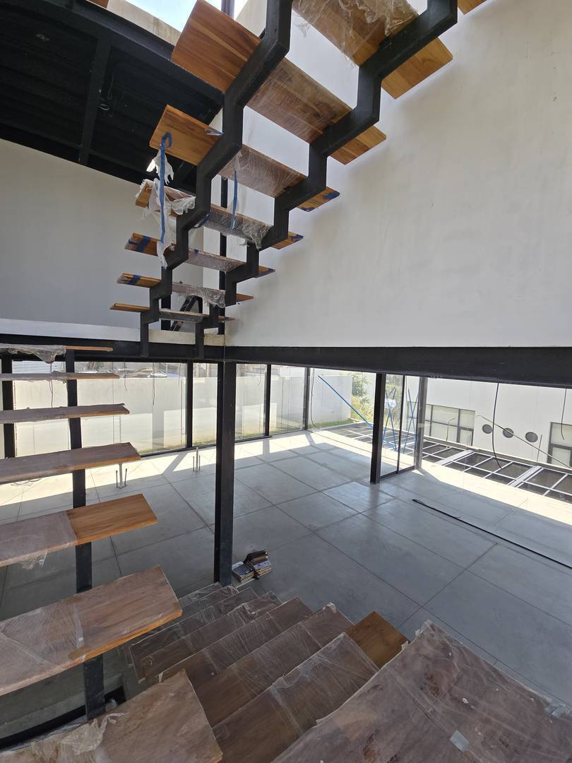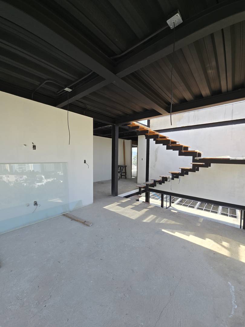 Al ingresar, un pequeño jardín rodea la entrada y conduce a un recibidor amplio que puede adaptarse como área de recepción o sala de espera. La planta baja alberga una cocina abierta con barra central, lista para instalar conexiones eléctricas y de gas, que se conecta con una sala-comedor de doble altura con ventanales de piso a techo y salida directa a una terraza o jardín. También en este nivel se encuentra un medio baño para visitas y un área de lavado con cuarto de servicio independiente. La ubicación del área de lavado, detrás de la cocina, permite mantener la privacidad y la funcionalidad sin interferencias visuales.