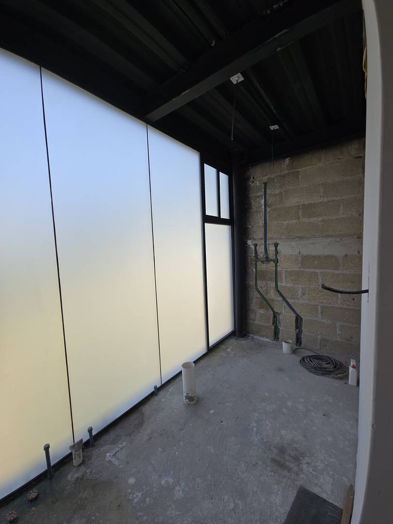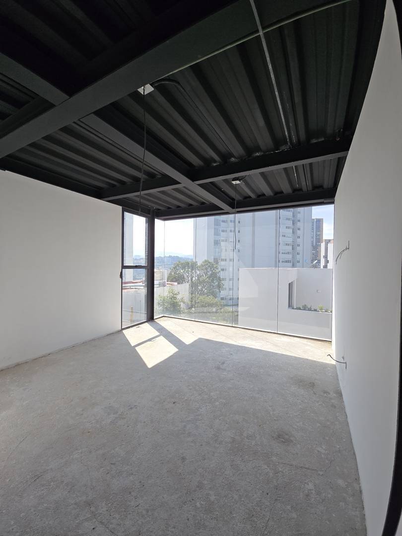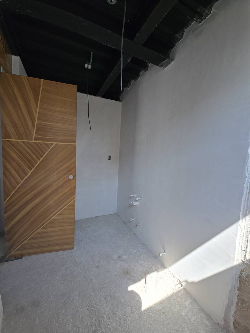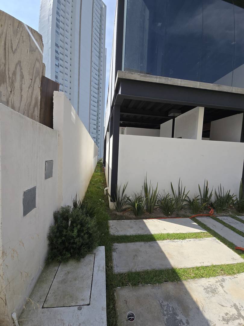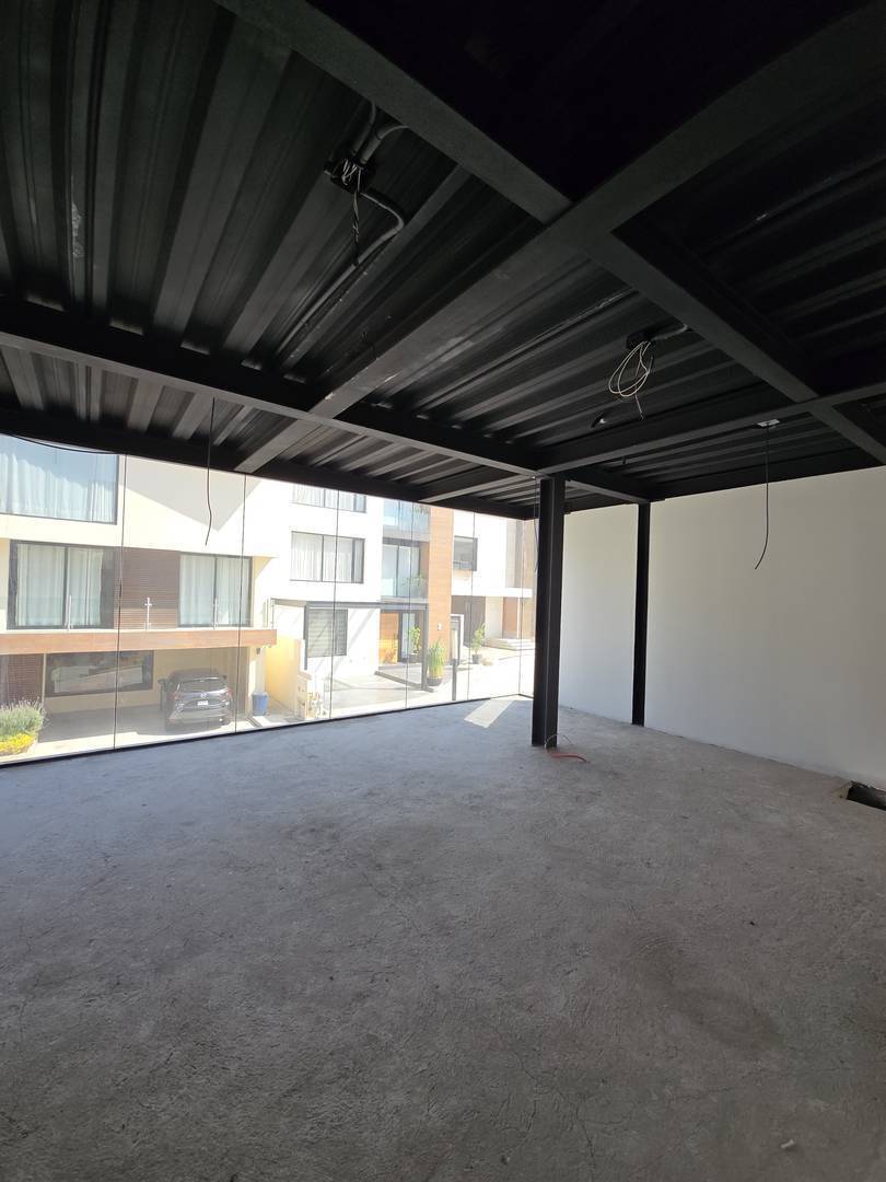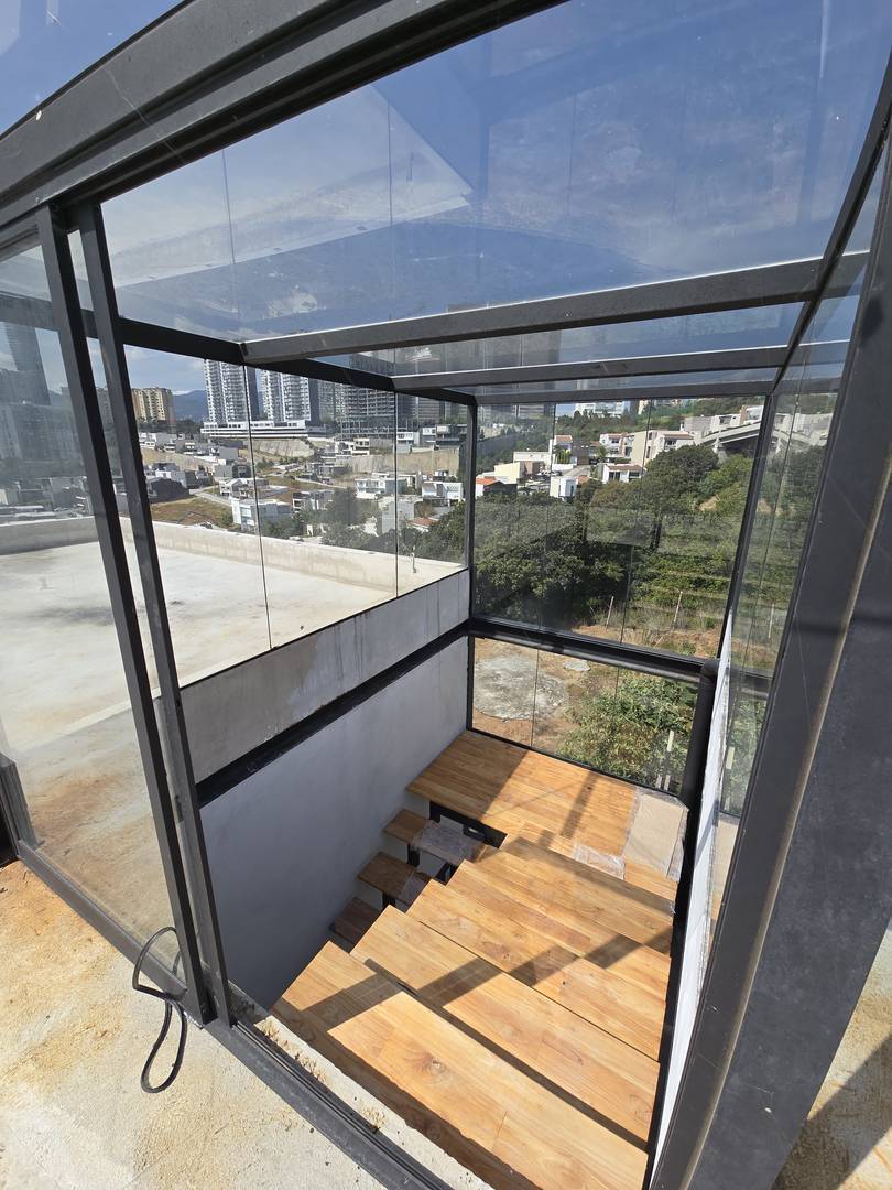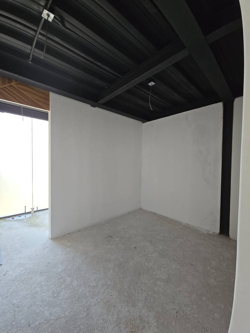 Al ingresar, un pequeño jardín rodea la entrada y conduce a un recibidor amplio que puede adaptarse como área de recepción o sala de espera. La planta baja alberga una cocina abierta con barra central, lista para instalar conexiones eléctricas y de gas, que se conecta con una sala-comedor de doble altura con ventanales de piso a techo y salida directa a una terraza o jardín. También en este nivel se encuentra un medio baño para visitas y un área de lavado con cuarto de servicio independiente. La ubicación del área de lavado, detrás de la cocina, permite mantener la privacidad y la funcionalidad sin interferencias visuales.