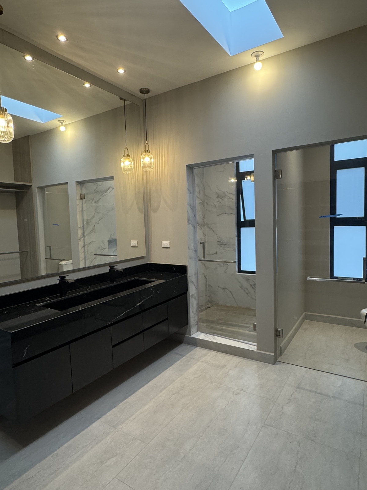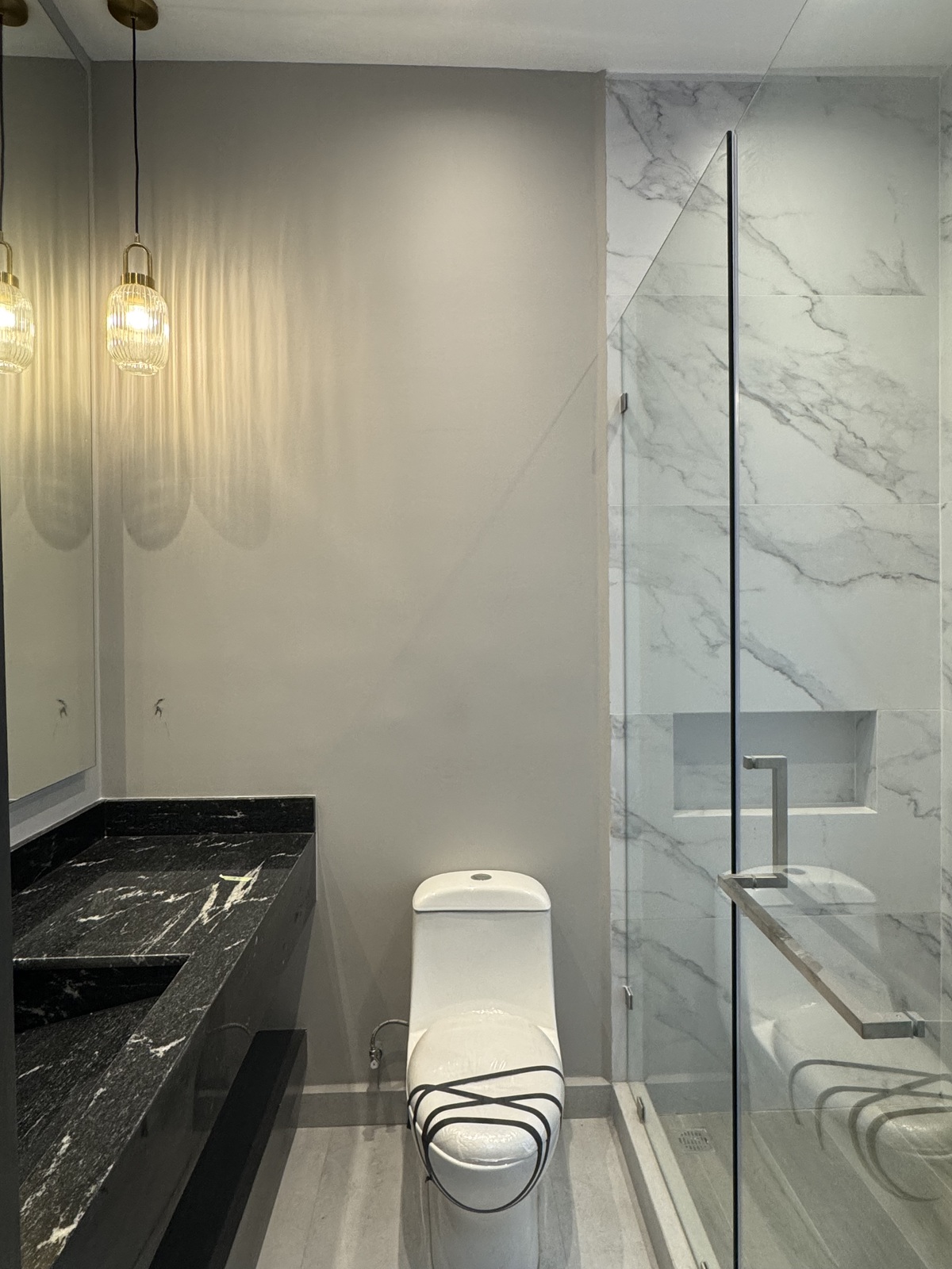 Pisos de porcelanato, inclui espelhos, portas de chuveiro e closet de designer no banheiro