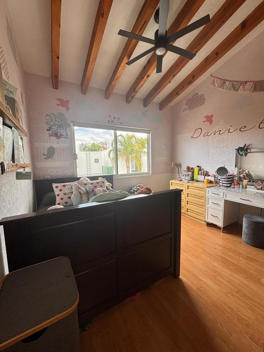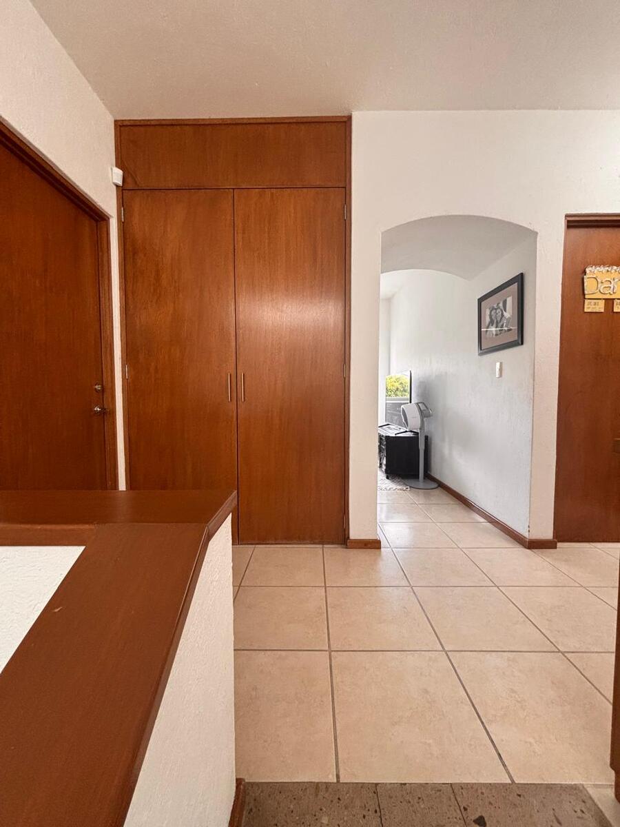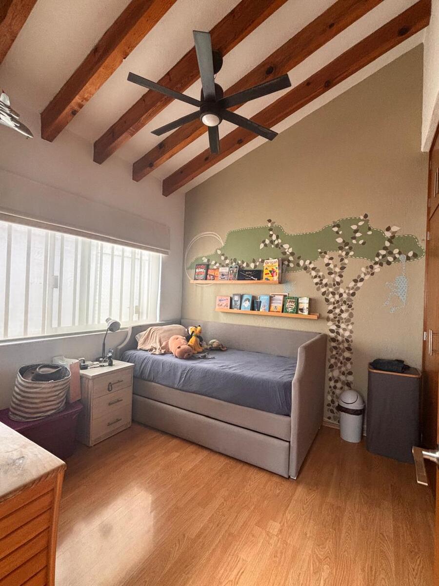 En la planta alta se ubican tres recámaras; la principal cuenta con techo inclinado, lo que le da un toque arquitectónico especial, además de baño y vestidor. Las secundarias comparten baño y tienen clósets amplios. También encontrarás un hall de televisión que puede adaptarse como sala familiar o área de estudio.