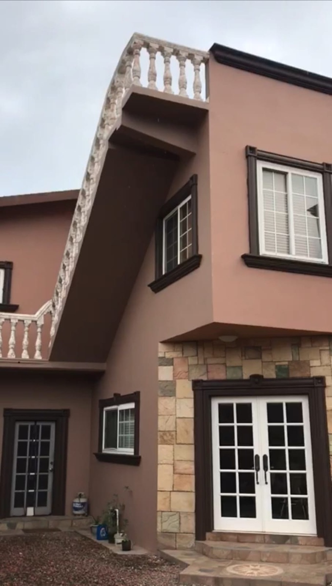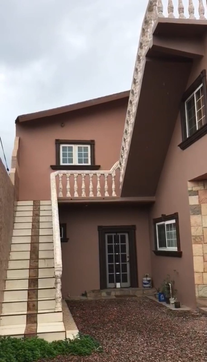 • Acabados exteriores: Fachada con piedra decorativa, molduras en tono oscuro, barandales tipo herrería artística, y detalles arquitectónicos elegantes.