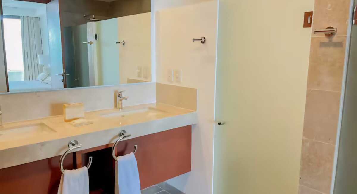*Banheiro completo e vistas para a lagoa.